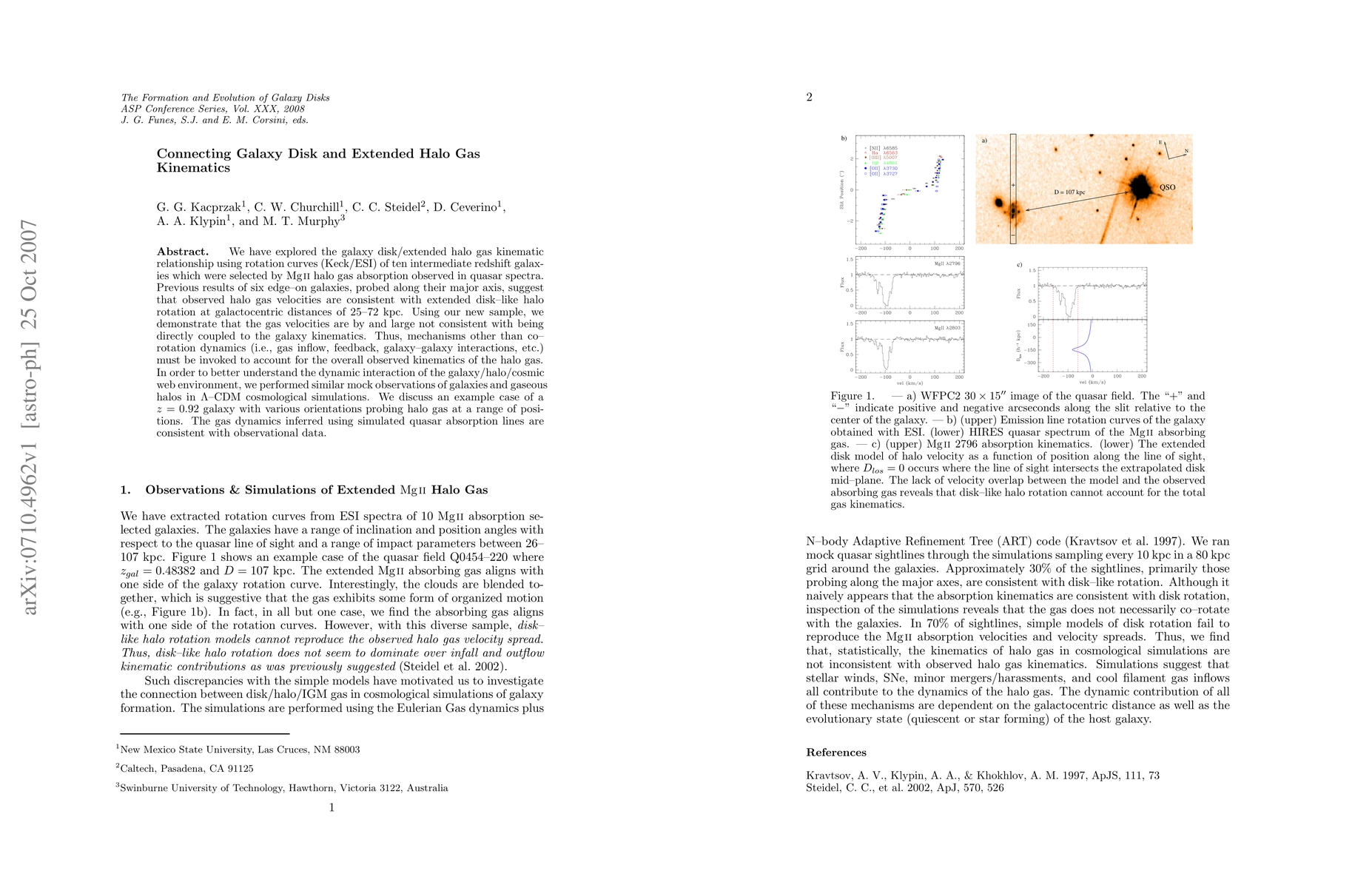 We have explored the galaxy disk/extended halo gas kinematic relationship using rotation curves (Keck/ESI) of ten intermediate redshift galaxies which were selected by MgII halo gas absorption observed in quasar spectra. Previous results of six edge-on galaxies, probed along their major axis, suggest that observed halo gas velocities are consistent with extended disk-like halo rotation at galactocentric distances of 25-72 kpc. Using our new sample, we demonstrate that the gas velocities are by and large not consistent with being directly coupled to the galaxy kinematics. Thus, mechanisms other than co-rotation dynamics (i.e., gas inflow, feedback, galaxy-galaxy interactions, etc.) must be invoked to account for the overall observed kinematics of the halo gas. In order to better understand the dynamic interaction of the galaxy/halo/cosmic web environment, we performed similar mock observations of galaxies and gaseous halos in Lambda-CDM cosmological simulations. We discuss an example case of a z=0.92 galaxy with various orientations probing halo gas at a range of positions. The gas dynamics inferred using simulated quasar absorption lines are consistent with observational data.