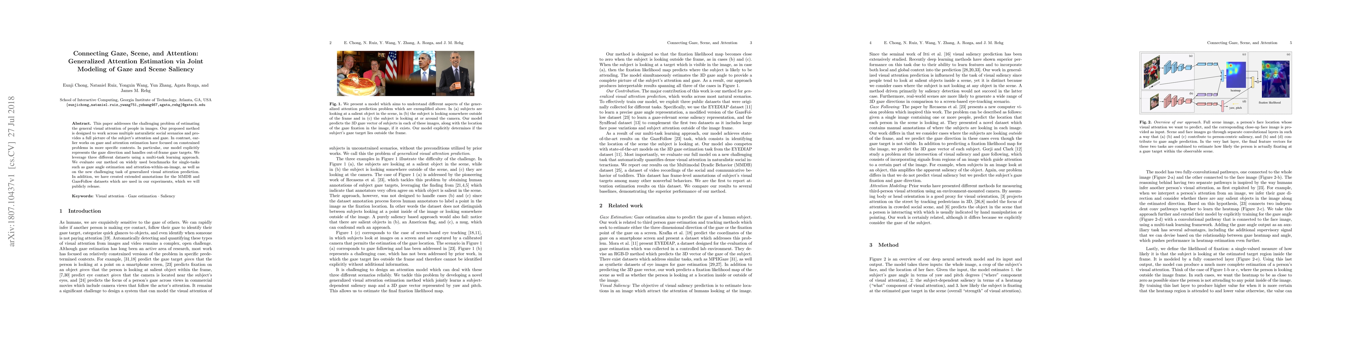 This paper proposes a method for estimating general visual attention across various naturalistic social scenarios by jointly modeling gaze and scene saliency. The model handles out-of-frame gaze targets and is evaluated on multiple benchmarks, including new tasks for generalized visual attention prediction.