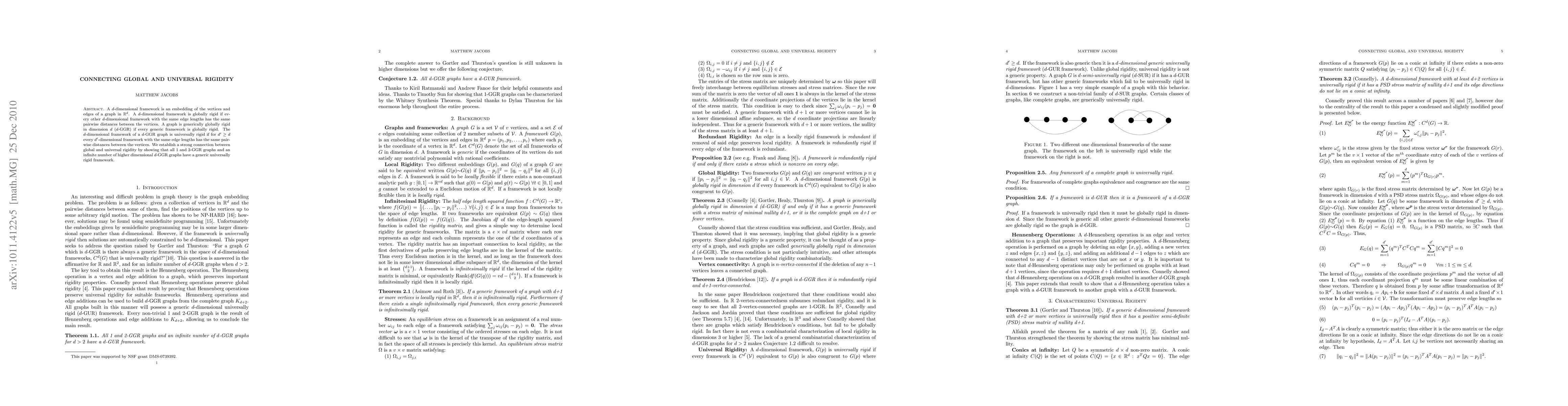 A d-dimensional framework is an embedding of the vertices and edges of a graph in Euclidean space. A d-dimensional framework is globally rigid if every other d-dimensional framework with the same edge lengths has the same pairwise distances between the vertices. A graph is generically globally rigid in dimension d (d-GGR) if every generic framework is globally rigid. The d-dimensional framework of a d-GGR graph is universally rigid if for d' greater than or equal to d every d'-dimensional framework with the same edge lengths has the same pairwise distances between the vertices. We establish a strong connection between global and universal rigidity by showing that all 1 and 2-GGR graphs and an infinite number of higher dimensional d-GGR graphs have a generic universally rigid framework.