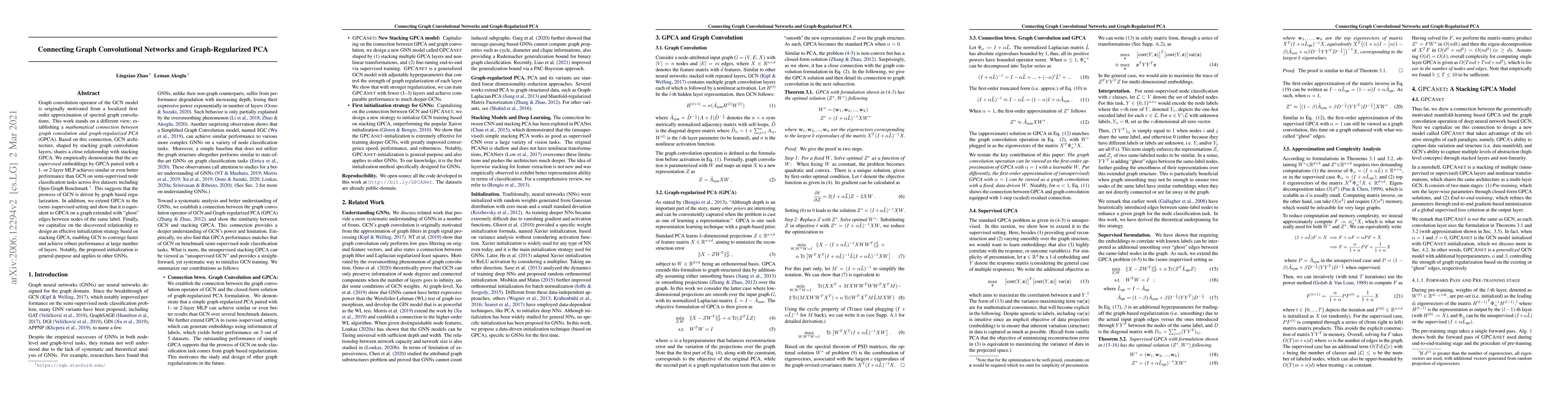 Graph convolution operator of the GCN model is originally motivated from a localized first-order approximation of spectral graph convolutions. This work stands on a different view; establishing a \textit{mathematical connection between graph convolution and graph-regularized PCA} (GPCA). Based on this connection, GCN architecture, shaped by stacking graph convolution layers, shares a close relationship with stacking GPCA. We empirically demonstrate that the \textit{unsupervised} embeddings by GPCA paired with a 1- or 2-layer MLP achieves similar or even better performance than GCN on semi-supervised node classification tasks across five datasets including Open Graph Benchmark \footnote{\url{https://ogb.stanford.edu/}}. This suggests that the prowess of GCN is driven by graph based regularization. In addition, we extend GPCA to the (semi-)supervised setting and show that it is equivalent to GPCA on a graph extended with "ghost" edges between nodes of the same label. Finally, we capitalize on the discovered relationship to design an effective initialization strategy based on stacking GPCA, enabling GCN to converge faster and achieve robust performance at large number of layers. Notably, the proposed initialization is general-purpose and applies to other GNNs.