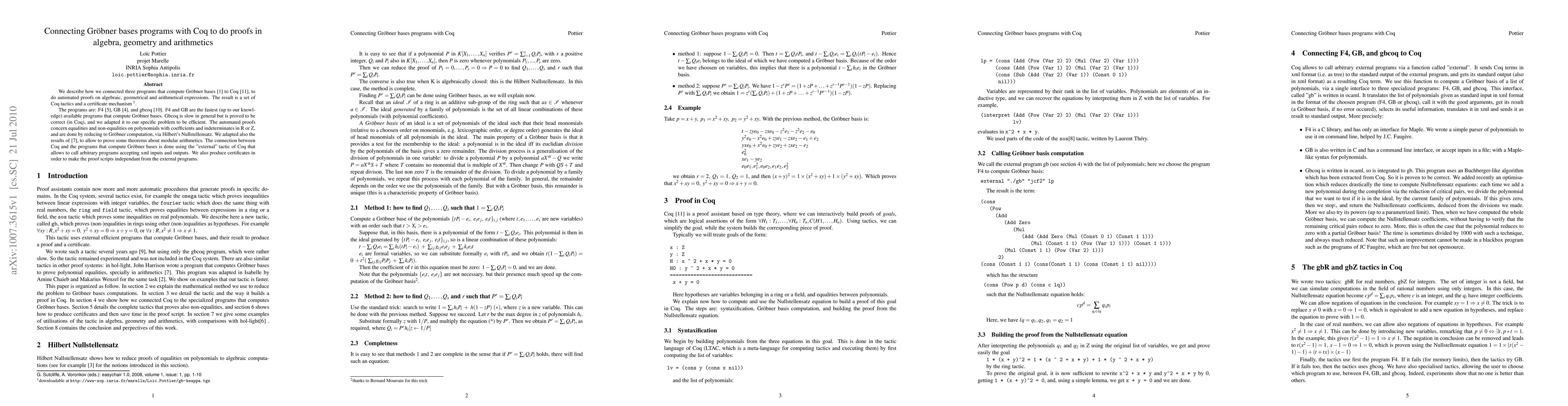 This paper connects three Groebner bases computation programs (F4, GB, and gbcoq) with Coq to automate proofs in algebra, geometry, and arithmetic. The integration uses Coq's "external" tactic and produces certificates to ensure proof independence from external programs.