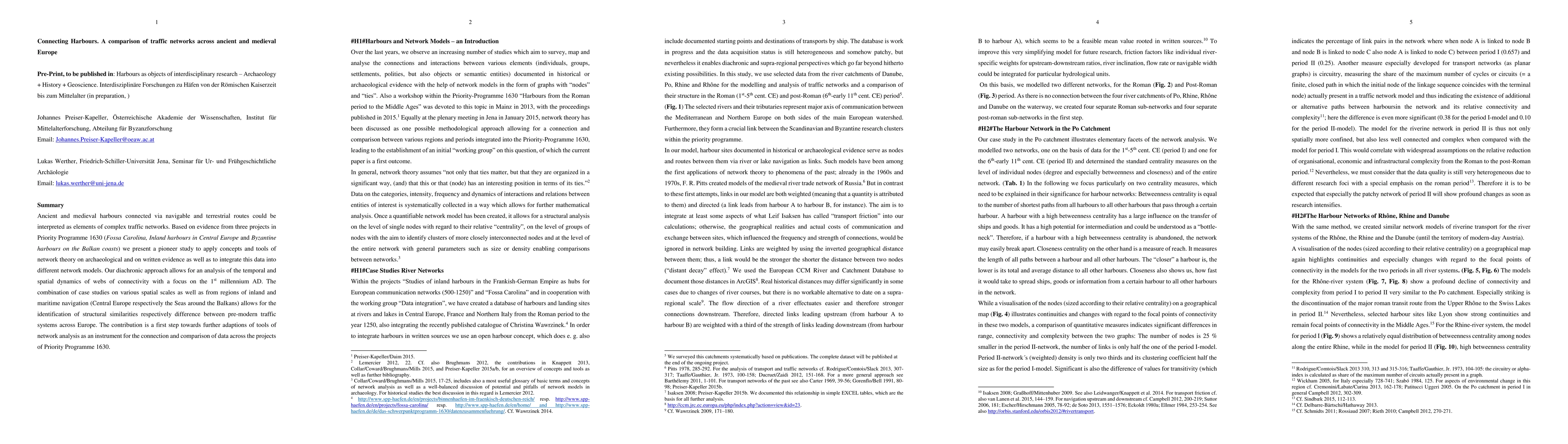 Ancient and medieval harbours connected via navigable and terrestrial routes could be interpreted as elements of complex traffic networks. Based on evidence from three projects in Priority Programme 1630 (Fossa Carolina, Inland harbours in Central Europe and Byzantine harbours on the Balkan coasts) we present a pioneer study to apply concepts and tools of network theory on archaeological and on written evidence as well as to integrate this data into different network models. Our diachronic approach allows for an analysis of the temporal and spatial dynamics of webs of connectivity with a focus on the 1st millennium AD. The combination of case studies on various spatial scales as well as from regions of inland and maritime navigation (Central Europe respectively the Seas around the Balkans) allows for the identification of structural similarities respectively difference between pre-modern traffic systems across Europe. The contribution is a first step towards further adaptions of tools of network analysis as an instrument for the connection and comparison of data across the projects of Priority Programme 1630.