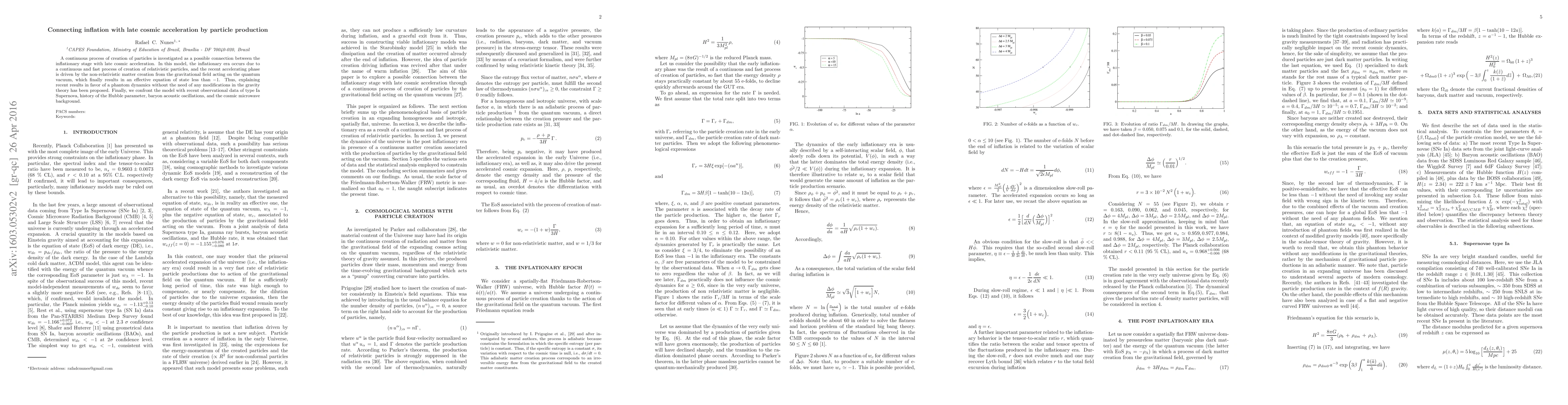 This paper proposes a model linking inflation and late cosmic acceleration through continuous particle production, where inflation is driven by relativistic particles and late acceleration by non-relativistic matter creation from quantum vacuum interactions. The model is consistent with observational data from supernovae, Hubble parameter history, and cosmic microwave background.