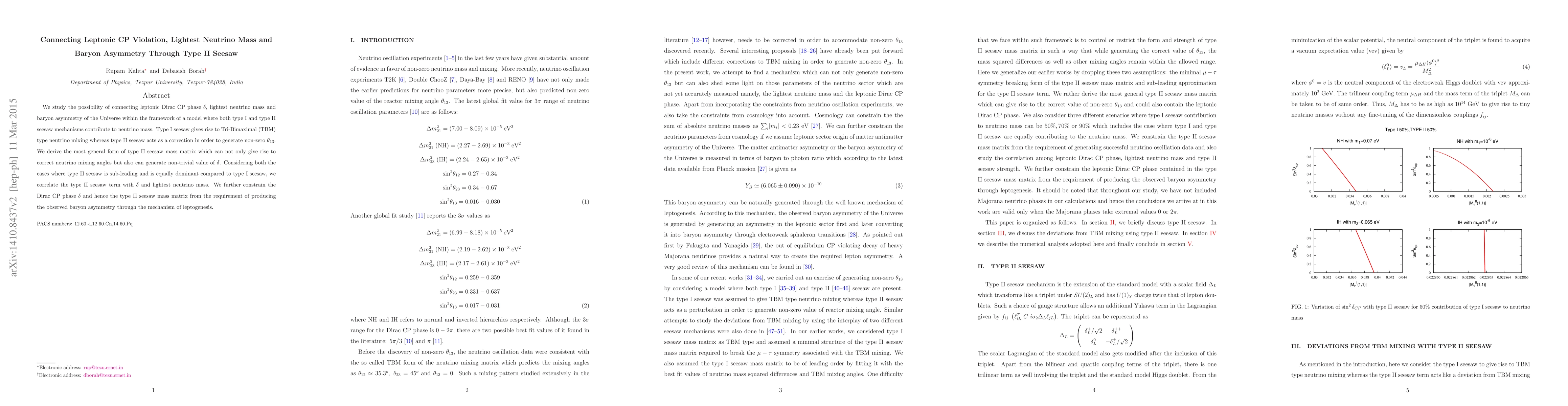 This paper explores a model combining type I and type II seesaw mechanisms to link leptonic CP violation, the lightest neutrino mass, and the Universe's baryon asymmetry. It derives a general type II seesaw mass matrix that influences neutrino mixing and CP phase, while also ensuring the generation of observed baryon asymmetry via leptogenesis.