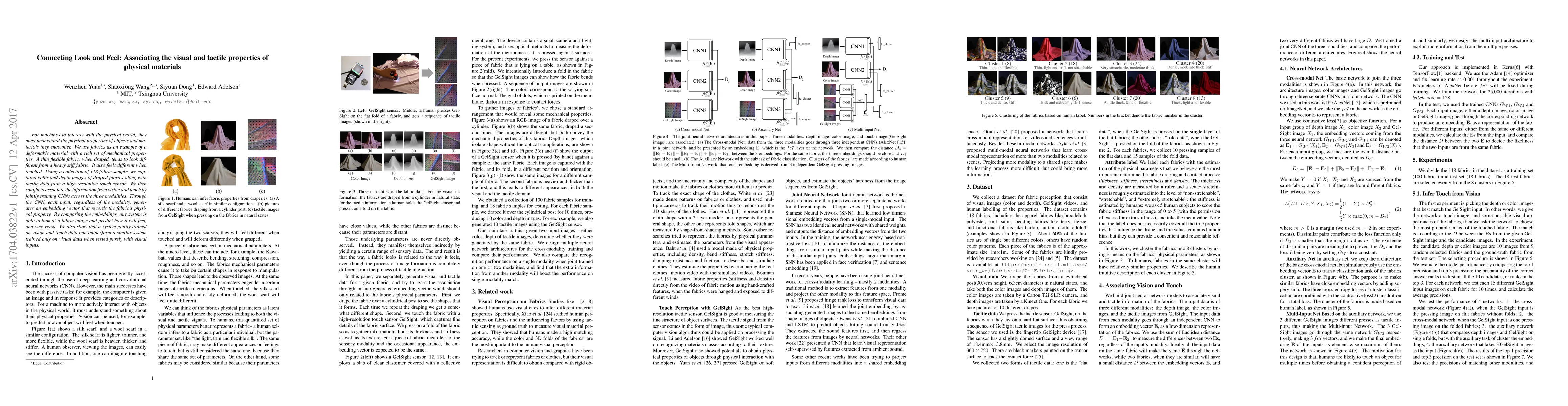 This paper explores how to associate visual and tactile properties of fabrics using convolutional neural networks (CNNs) to create embeddings from both visual and tactile data, enabling predictions of how a fabric will look based on its tactile properties and vice versa. The study demonstrates that joint training on both visual and tactile data improves performance compared to training on visual data alone.