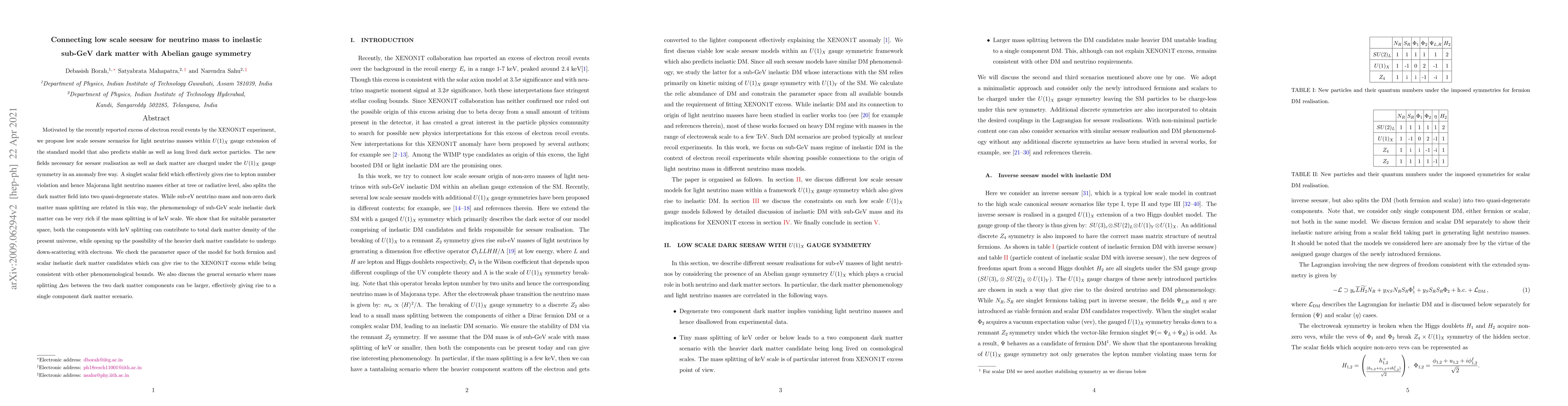 Motivated by the recently reported excess of electron recoil events by the XENON1T experiment, we propose low scale seesaw scenarios for light neutrino masses within $U(1)_X$ gauge extension of the standard model that also predicts stable as well as long lived dark sector particles. The new fields necessary for seesaw realisation as well as dark matter are charged under the $U(1)_X$ gauge symmetry in an anomaly free way. A singlet scalar field which effectively gives rise to lepton number violation and hence Majorana light neutrino masses either at tree or radiative level, also splits the dark matter field into two quasi-degenerate states. While sub-eV neutrino mass and non-zero dark matter mass splitting are related in this way, the phenomenology of sub-GeV scale inelastic dark matter can be very rich if the mass splitting is of keV scale. We show that for suitable parameter space, both the components with keV splitting can contribute to total dark matter density of the present universe, while opening up the possibility of the heavier dark matter candidate to undergo down-scattering with electrons. We check the parameter space of the model for both fermion and scalar inelastic dark matter candidates which can give rise to the XENON1T excess while being consistent with other phenomenological bounds. We also discuss the general scenario where mass splitting~$\Delta m$ between the two dark matter components can be larger, effectively giving rise to a single component dark matter scenario.