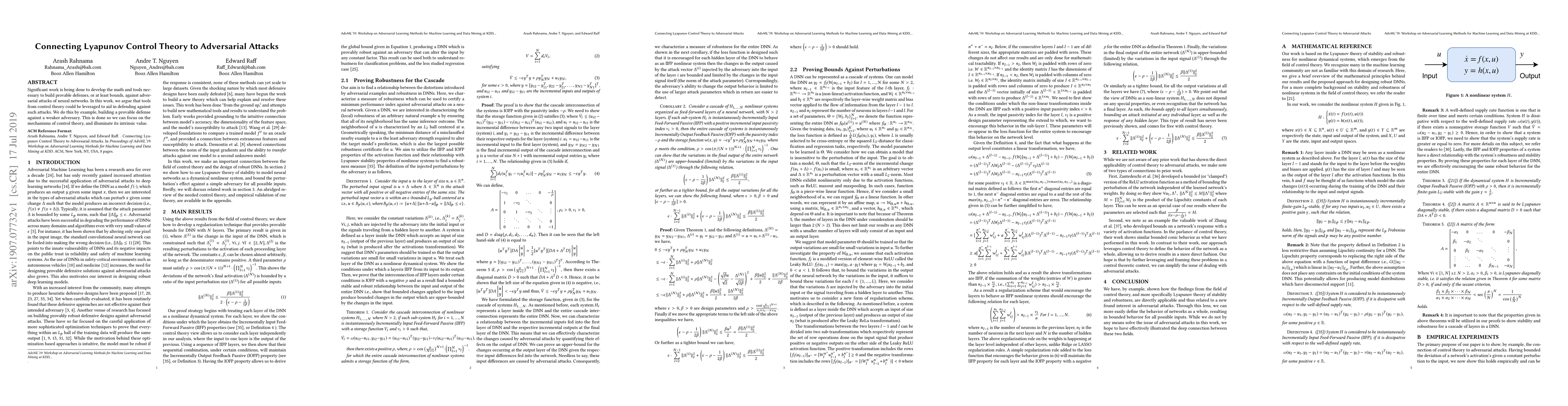Significant work is being done to develop the math and tools necessary to build provable defenses, or at least bounds, against adversarial attacks of neural networks. In this work, we argue that tools from control theory could be leveraged to aid in defending against such attacks. We do this by example, building a provable defense against a weaker adversary. This is done so we can focus on the mechanisms of control theory, and illuminate its intrinsic value.