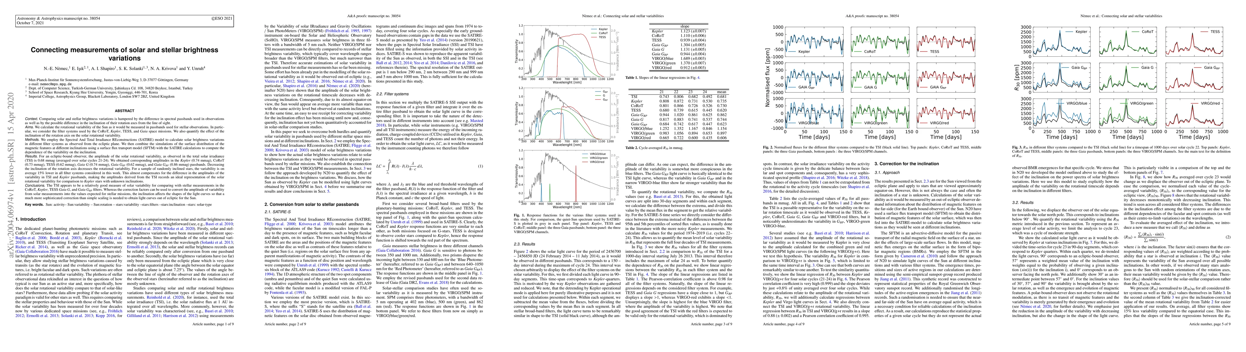 This paper compares solar and stellar brightness variations using the spectral passbands of CoRoT, Kepler, TESS, and Gaia missions. It finds that the solar rotational variability in these passbands ranges from 0.62 to 0.86 mmag, with decreasing inclination of the rotation axis reducing variability. The study concludes that solar variability in total solar irradiance is a good proxy for comparing with Kepler stars.
