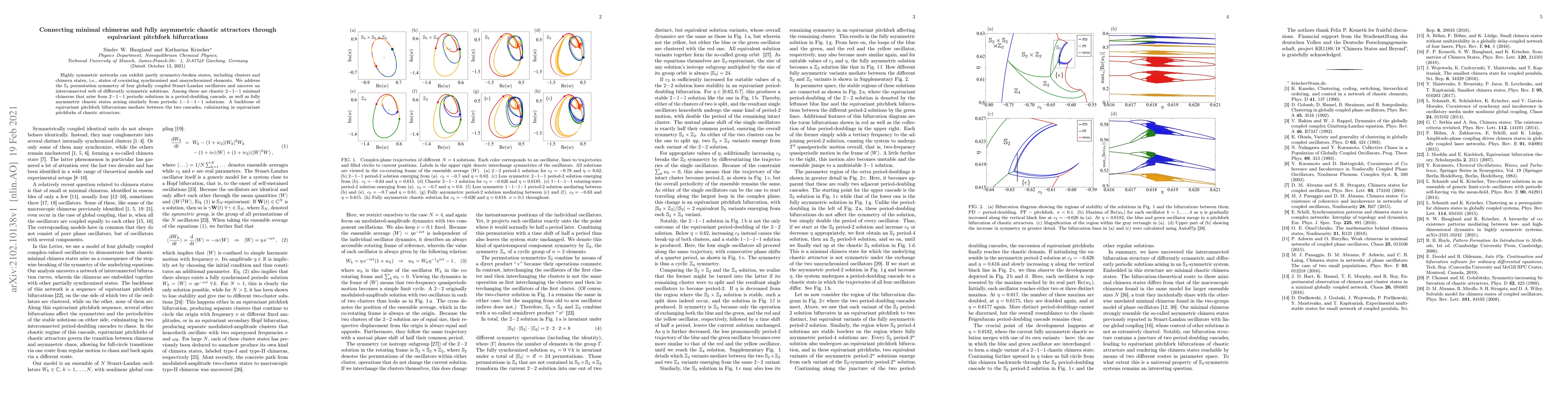 Highly symmetric networks can exhibit partly symmetry-broken states, including clusters and chimera states, i.e., states of coexisting synchronized and unsynchronized elements. We address the $\mathbb{S}_4$ permutation symmetry of four globally coupled Stuart-Landau oscillators and uncover an interconnected web of differently symmetric solutions. Among these are chaotic $2\!-\!1\!-\!1$ minimal chimeras that arise from $2\!-\!1\!-\!1$ periodic solutions in a period-doubling cascade, as well as fully asymmetric chaotic states arising similarly from periodic $1\!-\!1\!-\!1\!-\!1$ solutions. A backbone of equivariant pitchfork bifurcations mediate between the two cascades, culminating in equivariant pitchforks of chaotic attractors.