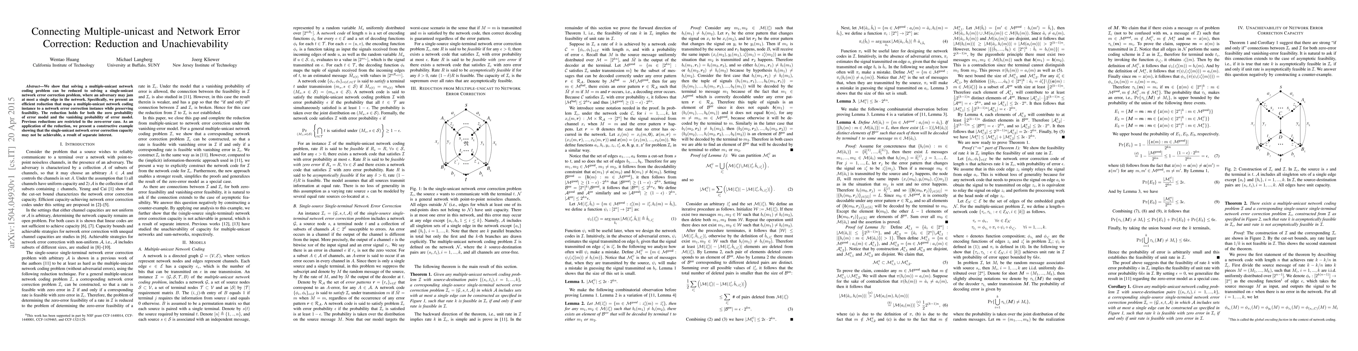 This paper demonstrates a reduction from multiple-unicast network coding to single-unicast network error correction, allowing for an adversary to jam a single edge. This reduction applies to both zero and vanishing probability of error models, extending previous zero-error reductions, and shows that single-unicast network error correction capacity may not always be achievable.