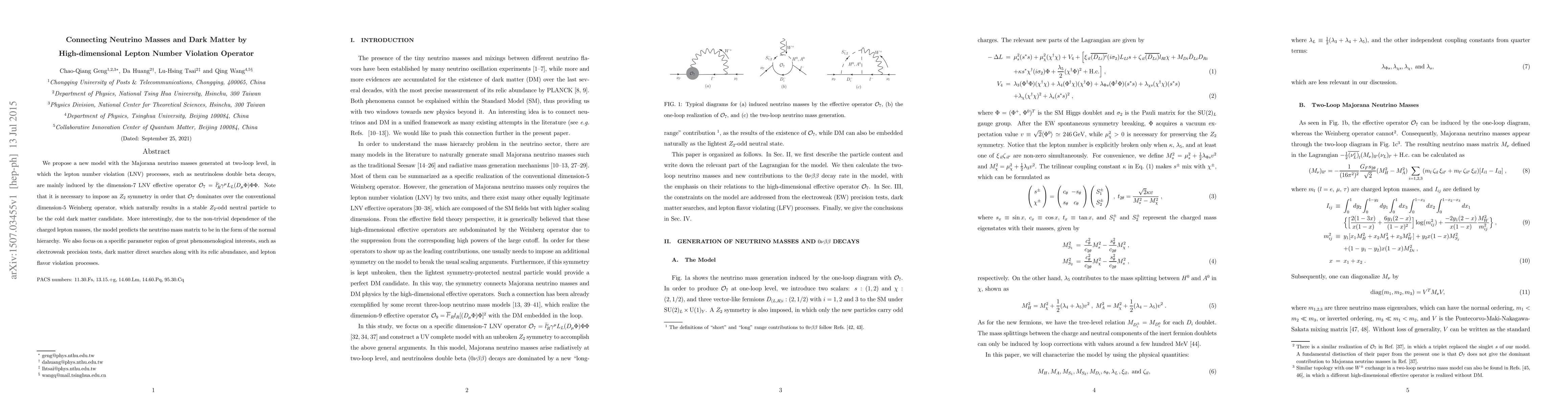 This paper proposes a new model generating Majorana neutrino masses via a two-loop mechanism and lepton number violation through a dimension-7 operator, leading to a stable Z_2-odd particle as a dark matter candidate. The model predicts a normal neutrino hierarchy and explores its implications for electroweak precision tests, dark matter detection, and lepton flavor violation.