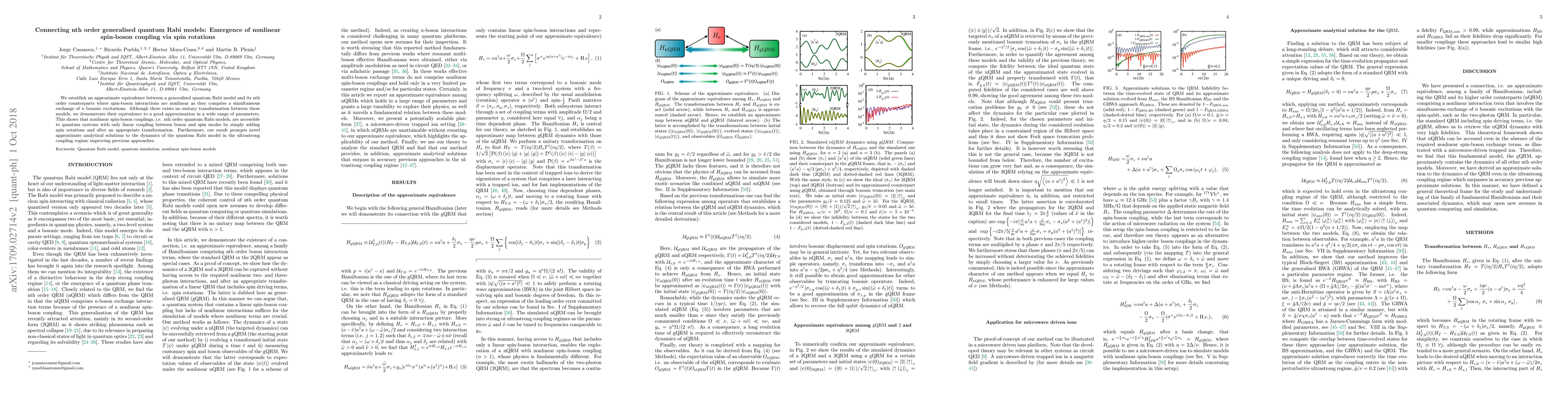 We establish an approximate equivalence between a generalised quantum Rabi model and its nth order counterparts where spin-boson interactions are nonlinear as they comprise a simultaneous exchange of $n$ bosonic excitations. Although there exists no unitary transformation between these models, we demonstrate their equivalence to a good approximation in a wide range of parameters. This shows that nonlinear spin-boson couplings, i.e. nth order quantum Rabi models, are accessible to quantum systems with only linear coupling between boson and spin modes by simply adding spin rotations and after an appropriate transformation. Furthermore, our result prompts novel approximate analytical solutions to the dynamics of the quantum Rabi model in the ultrastrong coupling regime improving previous approaches.