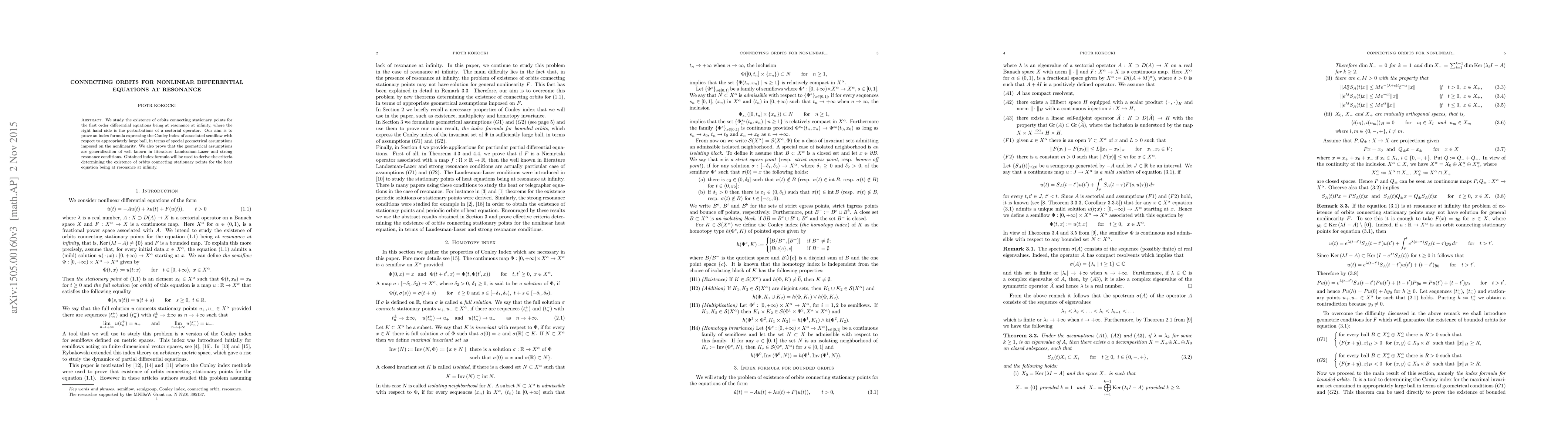 We study the existence of orbits connecting stationary points for the first order differential equations being at resonance at infinity, where the right hand side is the perturbations of a sectorial operator. Our aim is to prove an index formula expressing the Conley index of associated semiflow with respect to appropriately large ball, in terms of special geometrical assumptions imposed on the nonlinearity. We also prove that the geometrical assumptions are generalization of well known in literature Landesman-Lazer and strong resonance conditions. Obtained index formula will be used to derive the criteria determining the existence of orbits connecting stationary points for the heat equation being at resonance at infinity.