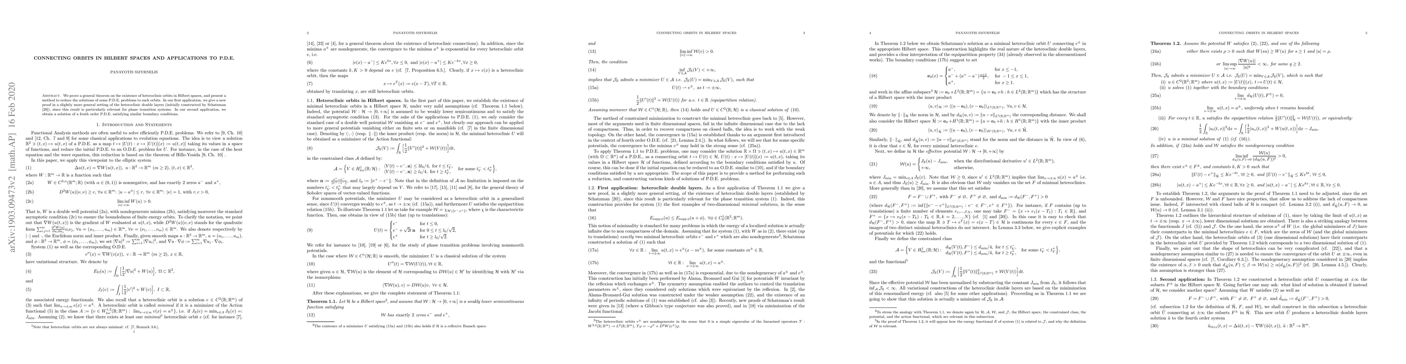 The paper proves a general theorem on heteroclinic orbits in Hilbert spaces and applies it to reduce solutions of P.D.E. problems, including phase transition systems and a fourth-order P.D.E.