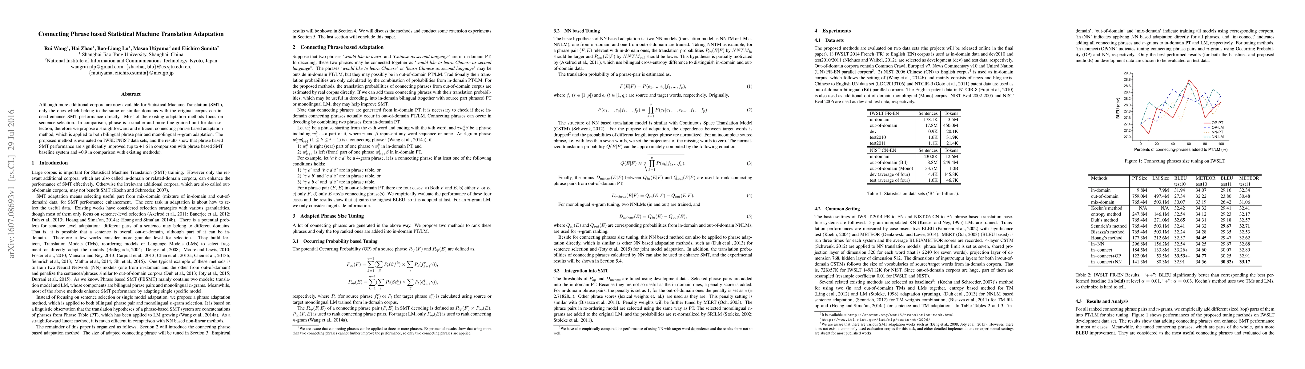 Although more additional corpora are now available for Statistical Machine Translation (SMT), only the ones which belong to the same or similar domains with the original corpus can indeed enhance SMT performance directly. Most of the existing adaptation methods focus on sentence selection. In comparison, phrase is a smaller and more fine grained unit for data selection, therefore we propose a straightforward and efficient connecting phrase based adaptation method, which is applied to both bilingual phrase pair and monolingual n-gram adaptation. The proposed method is evaluated on IWSLT/NIST data sets, and the results show that phrase based SMT performance are significantly improved (up to +1.6 in comparison with phrase based SMT baseline system and +0.9 in comparison with existing methods).