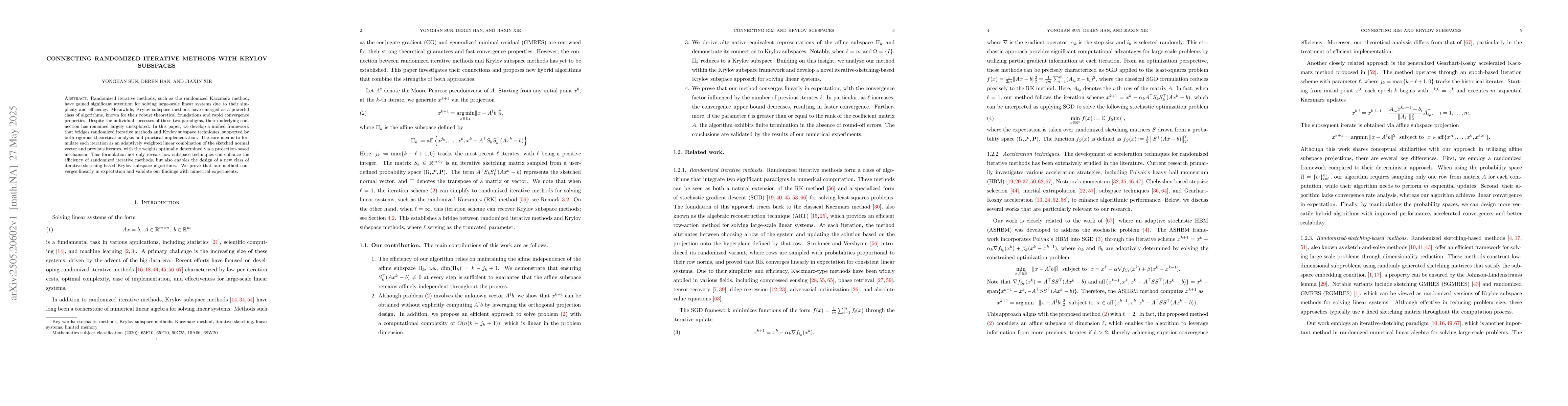 This work stands out by connecting two largely unexplored areas—randomized iterative methods and Krylov subspaces—providing a unified framework and new algorithmic designs.