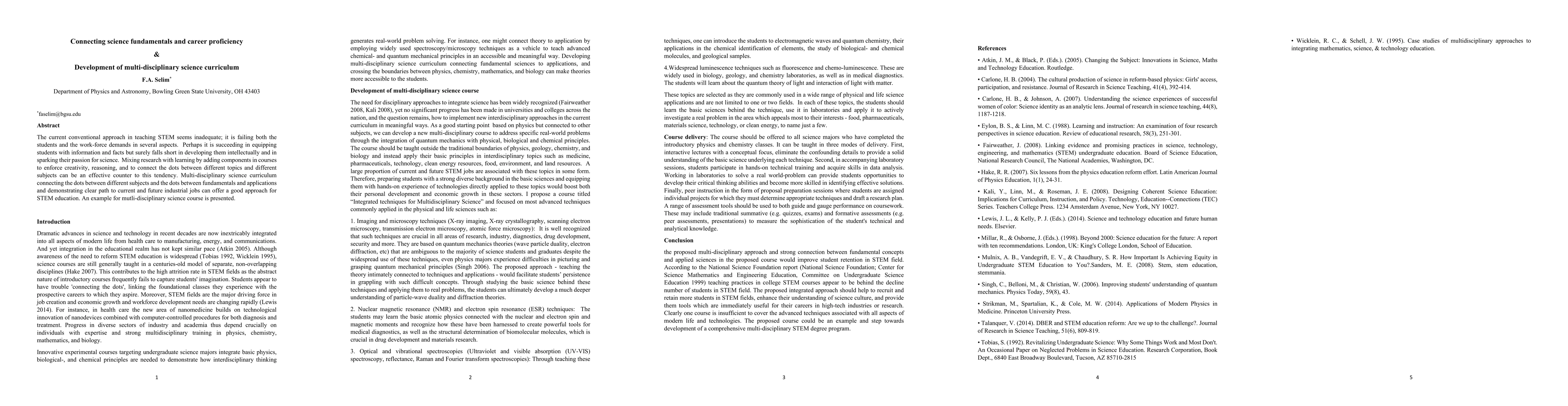 The current conventional approach in teaching STEM seems inadequate; it is failing both the students and the work-force demands in several aspects. Perhaps it is succeeding in equipping students with information and facts but surely falls short in developing them intellectually and in sparking their passion for science. Mixing research with learning by adding components in courses to enforce creativity, reasoning, and to connect the dots between different topics and different subjects can be an effective counter to this tendency. Multi-disciplinary science curriculum connecting the dots between different subjects and the dots between fundamentals and applications and demonstrating clear path to current and future industrial jobs can offer a good approach for STEM education. An example for mutli-disciplinary science course is presented.