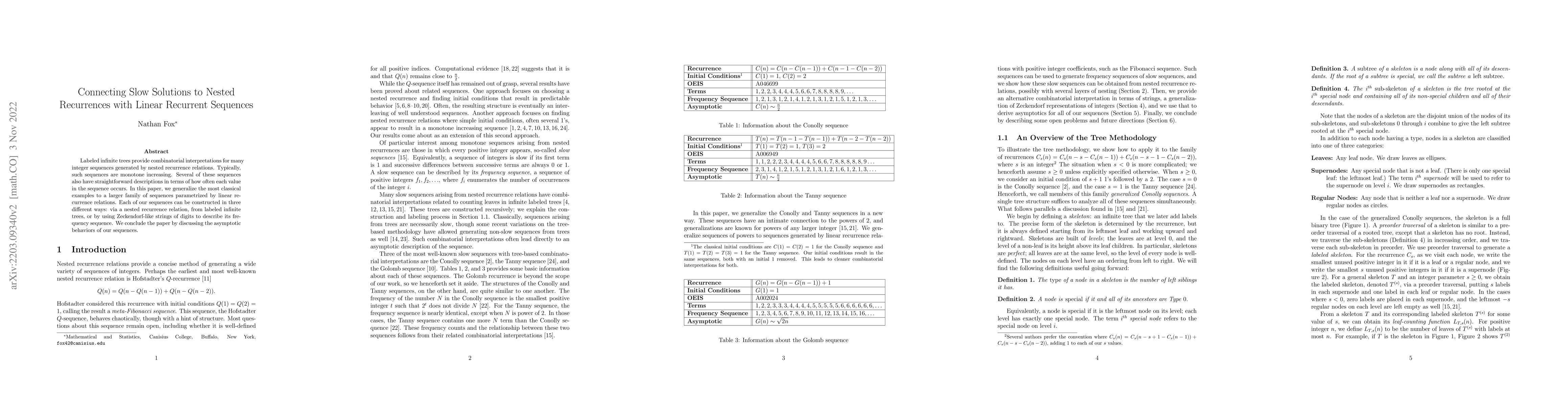 Labeled infinite trees provide combinatorial interpretations for many integer sequences generated by nested recurrence relations. Typically, such sequences are monotone increasing. Several of these sequences also have straightforward descriptions in terms of how often each value in the sequence occurs. In this paper, we generalize the most classical examples to a larger family of sequences parametrized by linear recurrence relations. Each of our sequences can be constructed in three different ways: via a nested recurrence relation, from labeled infinite trees, or by using Zeckendorf-like strings of digits to describe its frequency sequence. We conclude the paper by discussing the asymptotic behaviors of our sequences.
