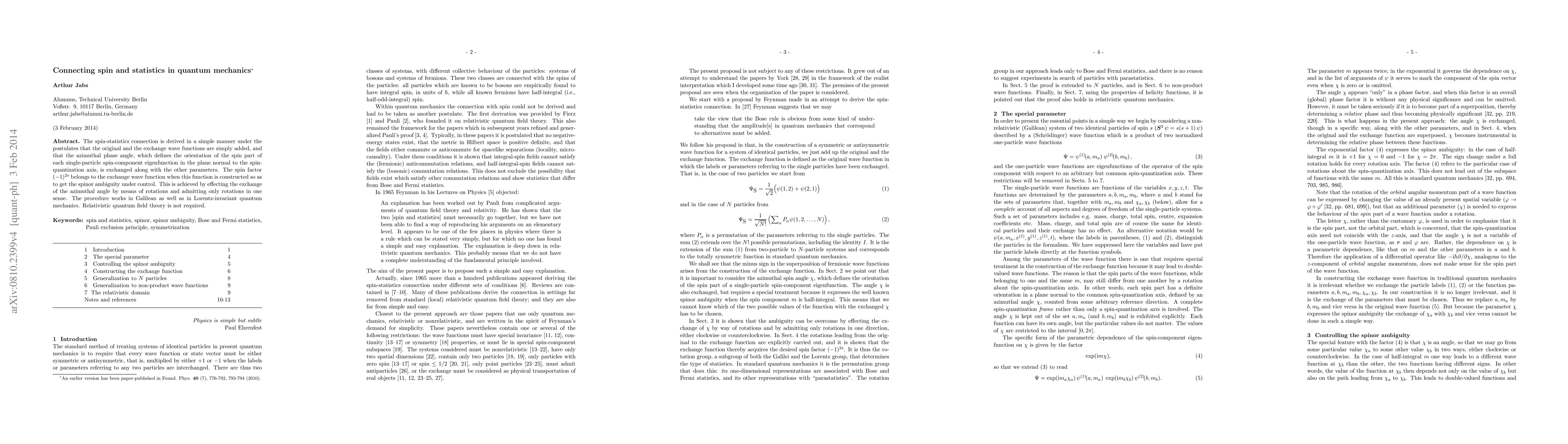 The spin-statistics connection is derived in a simple manner under the postulates that the original and the exchange wave functions are simply added, and that the azimuthal phase angle, which defines the orientation of the spin part of each single-particle spin-component eigenfunction in the plane normal to the spin-quantization axis, is exchanged along with the other parameters. The spin factor (-1)^2s belongs to the exchange wave function when this function is constructed so as to get the spinor ambiguity under control. This is achieved by effecting the exchange of the azimuthal angle by means of rotations and admitting only rotations in one sense. The procedure works in Galilean as well as in Lorentz-invariant quantum mechanics. Relativistic quantum field theory is not required.