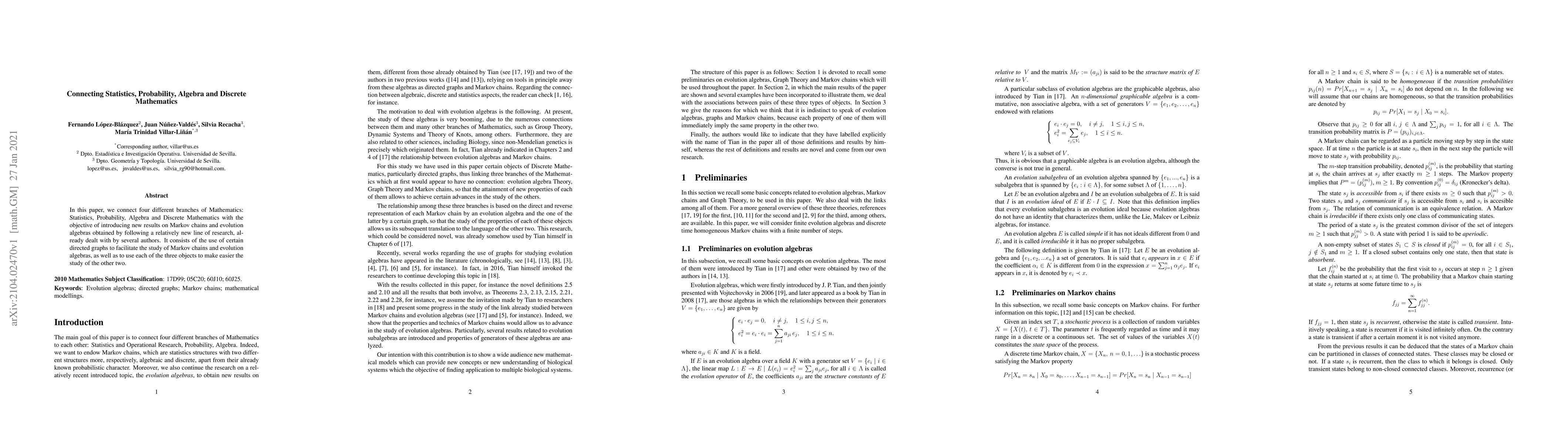 This paper integrates Statistics, Probability, Algebra, and Discrete Mathematics to introduce new results on Markov chains and evolution algebras, leveraging directed graphs to simplify their study and interlinking these mathematical areas.