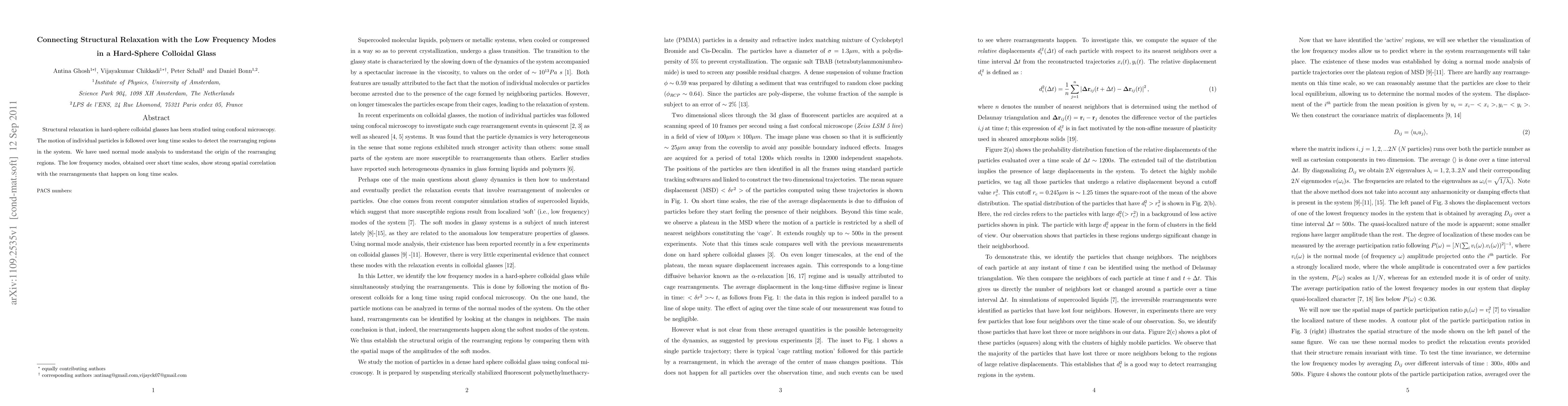 This study investigates structural relaxation in hard-sphere colloidal glasses via confocal microscopy, revealing that low frequency modes correlate with long-term particle rearrangements, as identified through normal mode analysis.