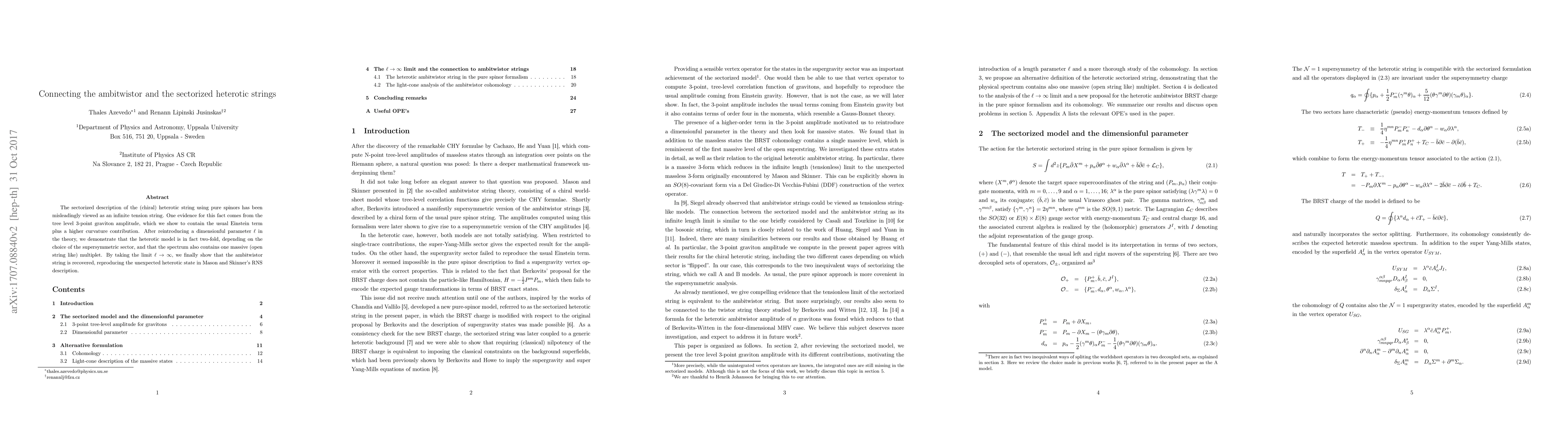 This paper clarifies that the sectorized heterotic string, previously thought to be an infinite tension string, actually contains a massive multiplet and is two-fold depending on the supersymmetric sector. By taking the limit of a large dimensionful parameter, it shows the connection to the ambitwistor string.