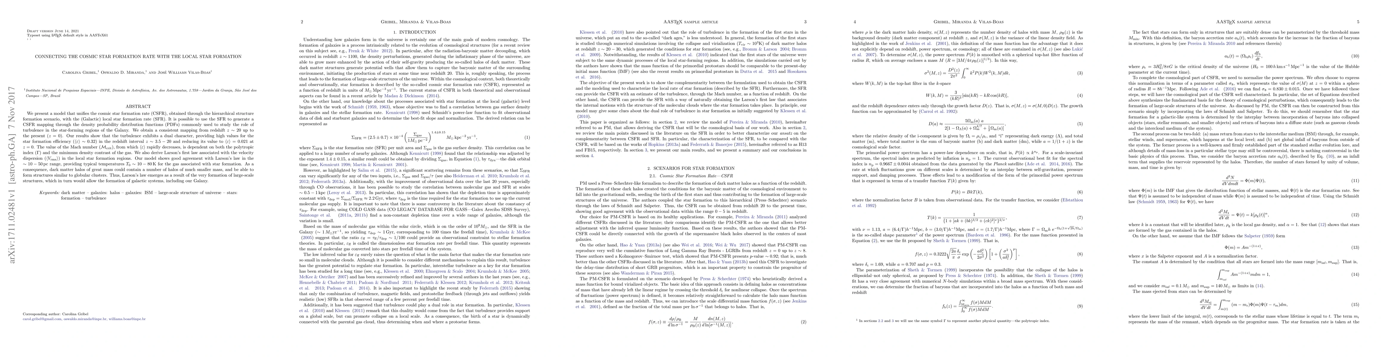 We present a model that unifies the cosmic star formation rate (CSFR), obtained through the hierarchical structure formation scenario, with the (Galactic) local star formation rate (SFR). It is possible to use the SFR to generate a CSFR mapping through the density probability distribution functions (PDFs) commonly used to study the role of turbulence in the star-forming regions of the Galaxy. We obtain a consistent mapping from redshift $z\sim 20$ up to the present ($z = 0$). Our results show that the turbulence exhibits a dual character, providing high values for the star formation efficiency ($\langle\varepsilon\rangle \sim 0.32$) in the redshift interval $z\sim 3.5-20$ and reducing its value to $\langle\varepsilon\rangle = 0.021$ at $z = 0$. The value of the Mach number ($\mathcal{M}_{\rm crit}$), from which $\langle\varepsilon\rangle$ rapidly decreases, is dependent on both the polytropic index ($\Gamma$) and the minimum density contrast of the gas. We also derive Larson's first law associated with the velocity dispersion ($\langle V_{\rm rms}\rangle$) in the local star formation regions. Our model shows good agreement with Larson's law in the $\sim 10-50\,{\rm pc}$ range, providing typical temperatures $T_{0} \sim 10-80\,{\rm K}$ for the gas associated with star formation. As a consequence, dark matter halos of great mass could contain a number of halos of much smaller mass, and be able to form structures similar to globular clusters. Thus, Larson's law emerges as a result of the very formation of large-scale structures, which in turn would allow the formation of galactic systems, including our Galaxy.