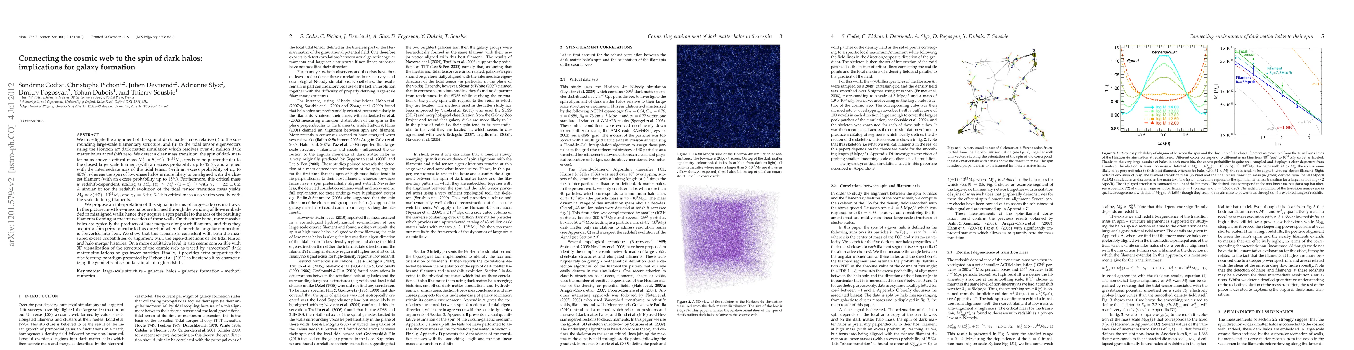 We investigate the alignment of the spin of dark matter halos relative (i) to the surrounding large-scale filamentary structure, and (ii) to the tidal tensor eigenvectors using the Horizon 4pi dark matter simulation which resolves over 43 million dark matter halos at redshift zero. We detect a clear mass transition: the spin of dark matter halos above a critical mass tends to be perpendicular to the closest filament, and aligned with the intermediate axis of the tidal tensor, whereas the spin of low-mass halos is more likely to be aligned with the closest filament. Furthermore, this critical mass of 5 10^12 is redshift-dependent and scales as (1+z)^-2.5. We propose an interpretation of this signal in terms of large-scale cosmic flows. In this picture, most low-mass halos are formed through the winding of flows embedded in misaligned walls; hence they acquire a spin parallel to the axis of the resulting filaments forming at the intersection of these walls. On the other hand, more massive halos are typically the products of later mergers along such filaments, and thus they acquire a spin perpendicular to this direction when their orbital angular momentum is converted into spin. We show that this scenario is consistent with both the measured excess probabilities of alignment w.r.t. the eigen-directions of the tidal tensor, and halo merger histories. On a more qualitative level, it also seems compatible with 3D visualization of the structure of the cosmic web as traced by "smoothed" dark matter simulations or gas tracer particles. Finally, it provides extra support to the disc forming paradigm presented by Pichon et al (2011) as it extends it by characterizing the geometry of secondary infall at high redshift.