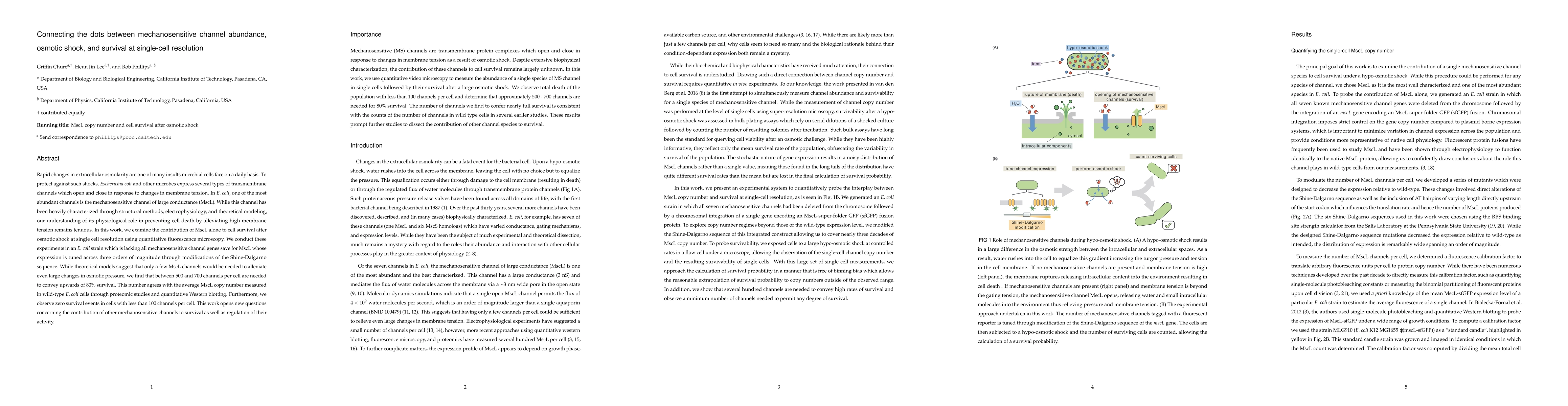 This study investigates the role of the mechanosensitive channel MscL in E. coli's survival during osmotic shock at single-cell resolution, finding that 500-700 MscL channels per cell are necessary for over 80% survival, aligning with wild-type MscL abundance. It raises questions about the contribution of other mechanosensitive channels and their regulation.