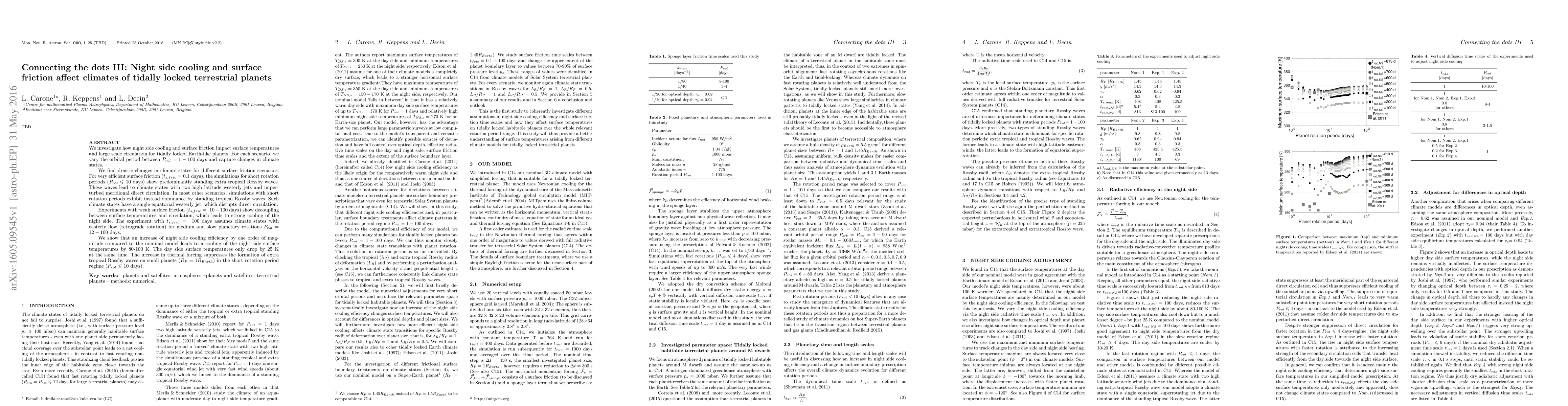 This research explores how night side cooling and surface friction influence the climate of tidally locked terrestrial planets, finding significant climate variations based on surface friction. High surface friction leads to distinct climate states with either two high-latitude westerly jets or a single equatorial jet, while weak surface friction results in decoupling between surface temperatures and circulation, causing substantial night side cooling.