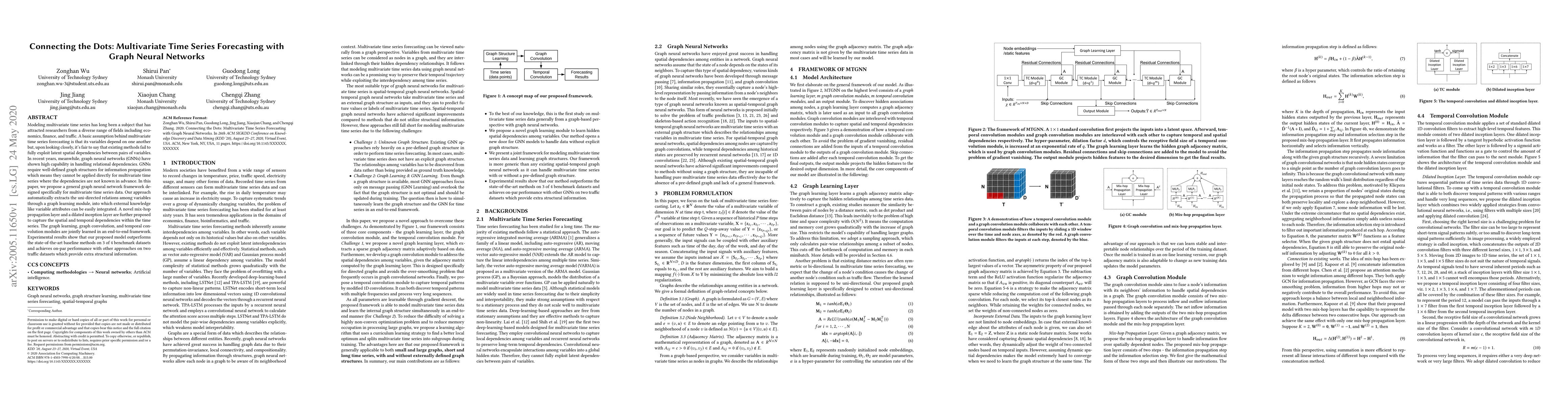 This paper proposes a graph neural network framework for multivariate time series forecasting that automatically extracts latent spatial dependencies among variables. The model integrates a graph learning module, mix-hop propagation layer, and dilated inception layer to capture both spatial and temporal dependencies, achieving superior performance on benchmark datasets compared to state-of-the-art methods.