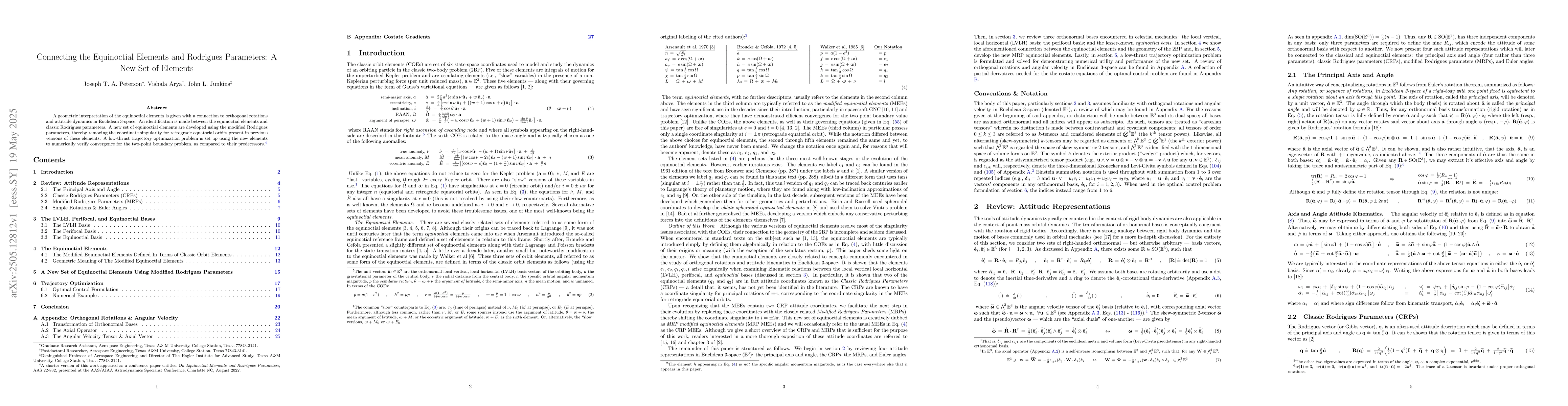 The paper provides a geometric interpretation of equinoctial elements, connecting them to orthogonal rotations and attitude dynamics in Euclidean 3-space. It identifies equinoctial elements with classic Rodrigues parameters and develops a new set using modified Rodrigues parameters to eliminate coordinate singularity for retrograde equatorial orbits.