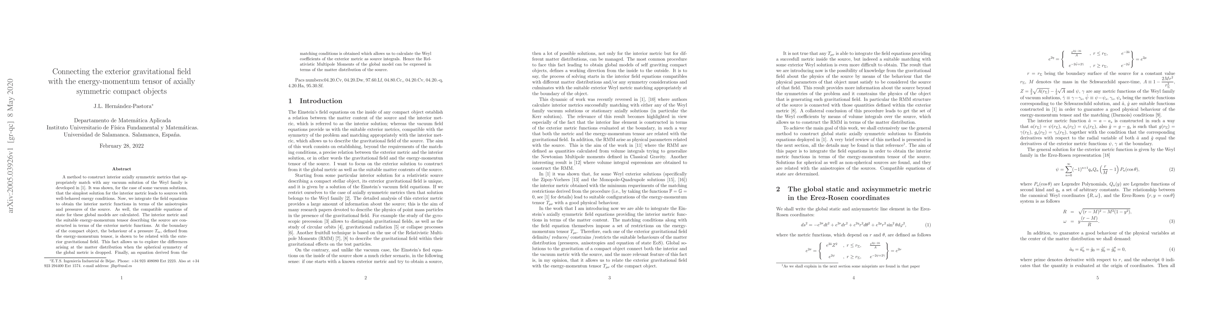 A method to construct interior axially symmetric metrics that appropriately match with any vacuum solution of the Weyl family is developed in Hernandez-Pastora etal. (Class Quantum Gravity 33:235005, 2016). It was shown,for the case of some vacuum solutions, that the simplestsolution for the interior metric leads to sources with well behaved energy conditions. Now, we integrate the field equa-tions to obtain the interior metric functions in terms of theanisotropies and pressures of the source. As well, the compatible equations of state for these global models are calculated. The interior metric and the suitable energy momentum tensor describing the source are constructed in terms of the exterior metric functions. At the boundary of the compact object,the behaviour of a pressure Tm, defined from the energy momentum tensor, is shown to be related with the exterior gravitational field. This fact allows us to explore the differences arising at the matter distribution when the sphericalsymmetry of the global metric is dropped. Finally, an equation derived from the matching conditions is obtained whichallows us to calculate the Weyl coefficients of the exteriormetric as source integrals. Hence the Relativistic MultipoleMoments of the global model can be expressed in terms ofthe matter distribution of the source.