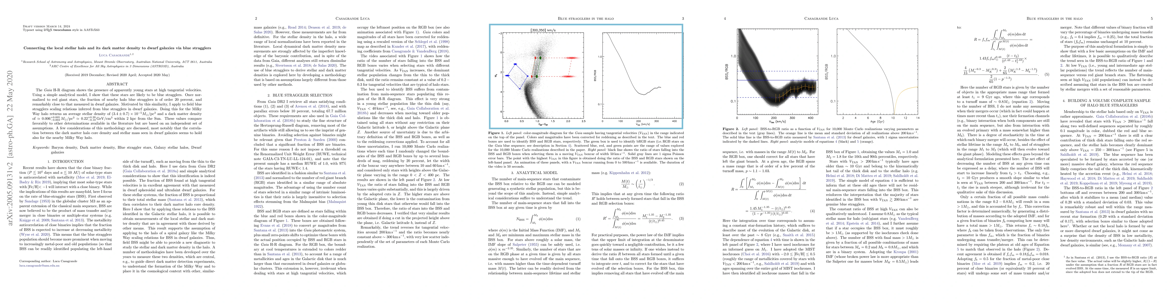 The Gaia HR diagram shows the presence of apparently young stars at high tangential velocities. Using a simple analytical model I show that these stars are likely to be blue stragglers. Once normalized to red giant stars, the fraction of nearby halo blue stragglers is of order 20 percent, and remarkably close to that measured in dwarf galaxies. Motivated by this similarity, I apply to field blue stragglers scaling relations inferred from blue stragglers in dwarf galaxies. Doing this for the Milky Way halo returns an average stellar density of 3.4 x 10^-5 Msun/pc^3 and a dark matter density of ~0.006 Msun/pc^3 ~ 0.22 GeV/cm^3 within 2 kpc from the Sun. These values compare favourably to other determinations available in the literature, but are based on an independent set of assumptions. A few considerations of this methodology are discussed, most notably that the correlation between the dark matter halo core-density and stellar mass seen in dwarf galaxies seems to hold also for the nearby Milky Way halo.