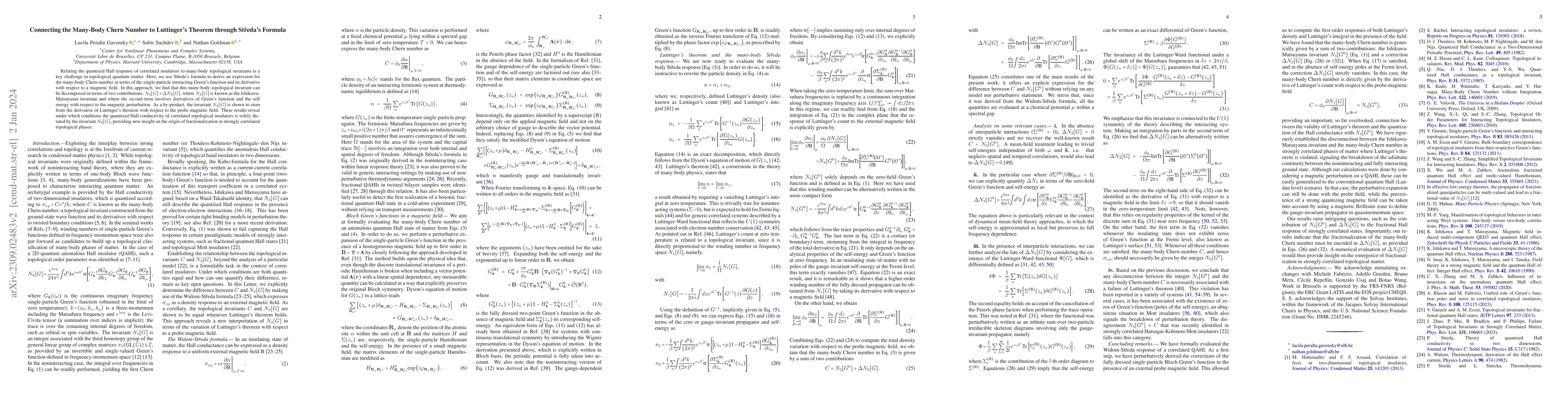 Relating the quantized Hall response of correlated insulators to many-body topological invariants is a key challenge in topological quantum matter. Here, we use Streda's formula to derive an expression for the many-body Chern number in terms of the single-particle interacting Green's function and its derivative with respect to a magnetic field. In this approach, we find that this many-body topological invariant can be decomposed in terms of two contributions, $N_3[G] + \Delta N_3[G]$, where $N_3[G]$ is known as the Ishikawa-Matsuyama invariant and where the second term involves derivatives of Green's function and the self energy with respect to the magnetic perturbation. As a by-product, the invariant $N_3[G]$ is shown to stem from the derivative of Luttinger's theorem with respect to the probe magnetic field. These results reveal under which conditions the quantized Hall conductivity of correlated topological insulators is solely dictated by the invariant $N_3[G]$, providing new insight on the origin of fractionalization in strongly-correlated topological phases.