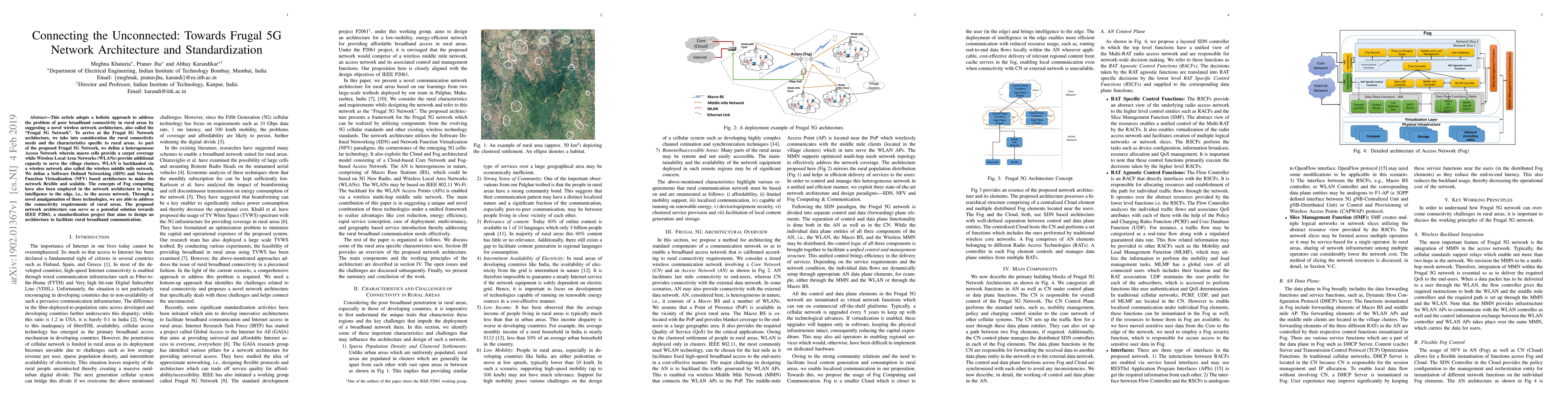 This paper proposes a "Frugal 5G Network" architecture to enhance rural broadband connectivity, integrating macro cells, WLANs, and a wireless middle mile network, alongside SDN, NFV, and Fog computing for flexibility and scalability. The architecture aims to meet IEEE P2061 standardization goals for rural broadband communication.