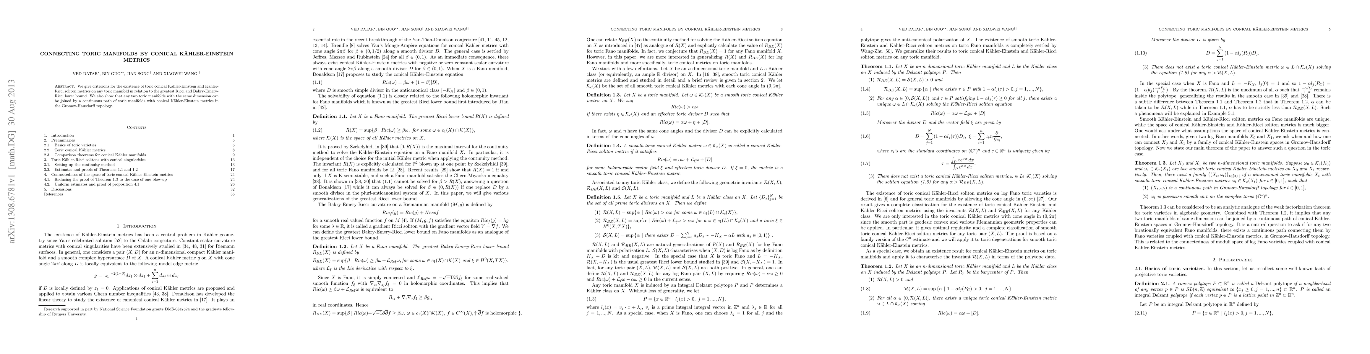 Summary: This paper provides criteria for the existence of conical Kahler-Einstein and Kahler-Ricci soliton metrics on toric manifolds, and demonstrates that any two toric manifolds of the same dimension can be connected through a continuous path in the Gromov-Hausdorff topology featuring such metrics.