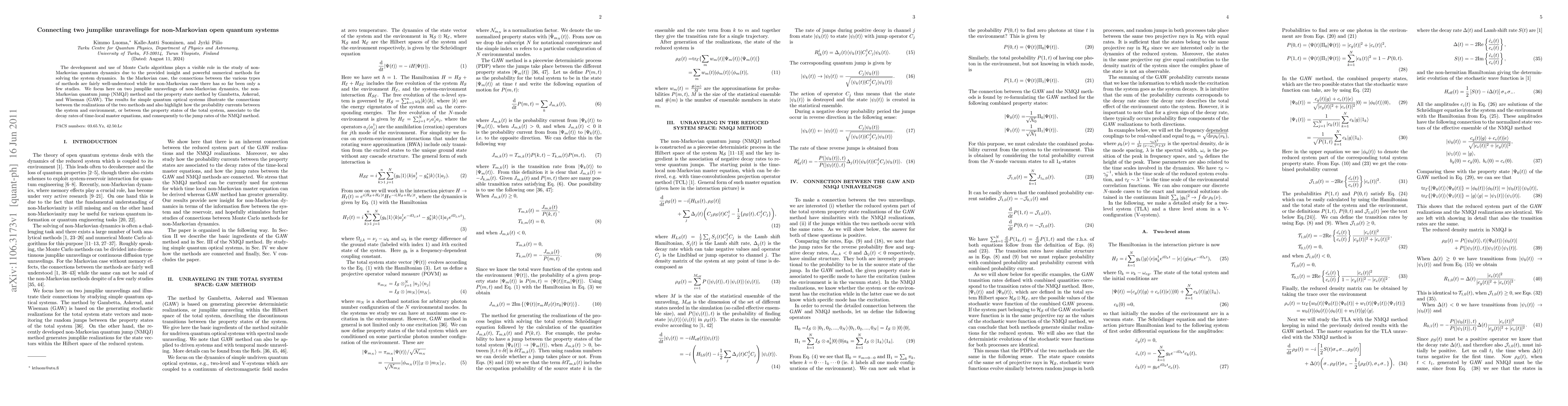 This paper explores connections between two unraveling methods for non-Markovian quantum dynamics: the non-Markovian quantum jump (NMQJ) method and the property state method by Gambetta, Askerud, and Wiseman (GAW). It highlights how probability currents relate to decay rates and jump rates in simple quantum optical systems.