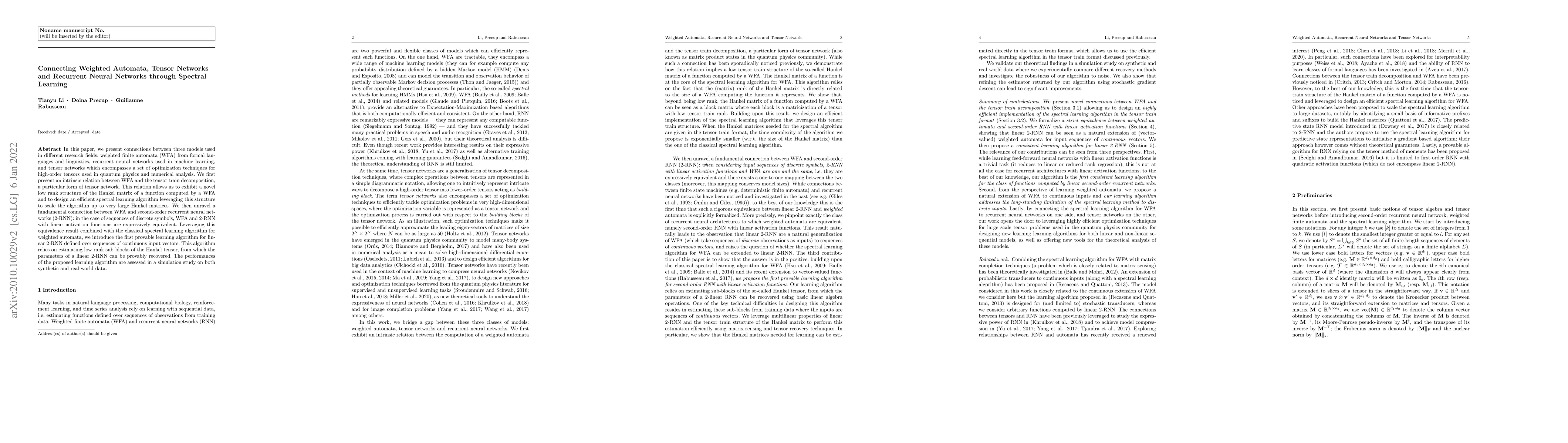 This paper establishes connections between weighted finite automata, tensor networks, and recurrent neural networks, demonstrating an equivalence between weighted finite automata and second-order recurrent neural networks. It introduces a spectral learning algorithm to efficiently scale up the learning process for large data sets.