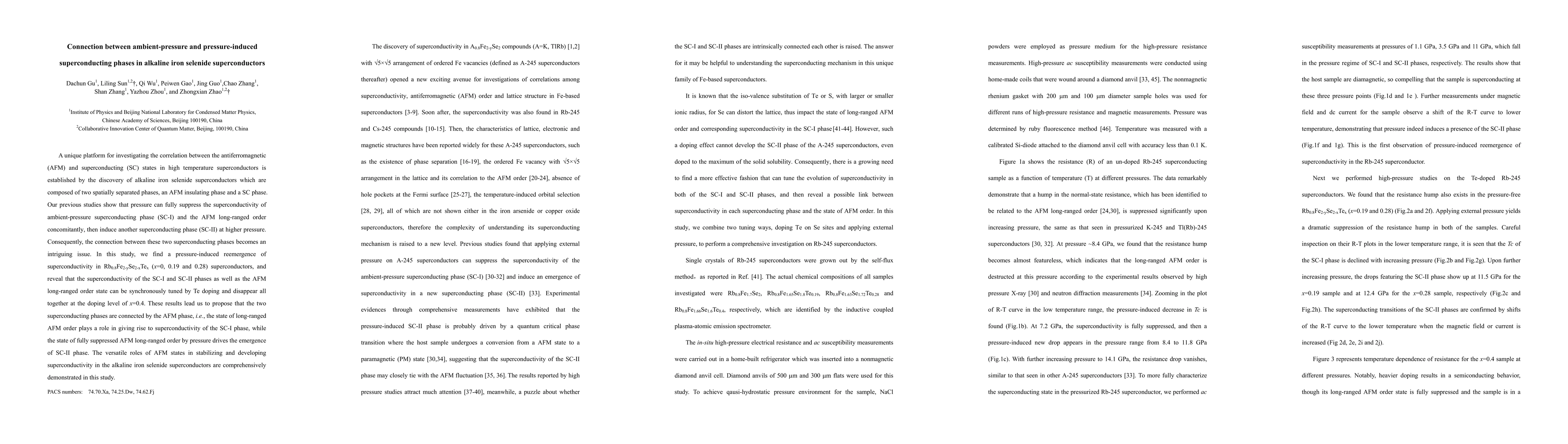 This study investigates the relationship between ambient-pressure and pressure-induced superconducting phases in alkaline iron selenide superconductors, revealing that Te doping can synchronously tune both superconducting phases and the antiferromagnetic (AFM) order, which plays a crucial role in stabilizing superconductivity. The findings suggest that the AFM phase influences the SC-I phase, while the fluctuation of the suppressed AFM phase drives the emergence of SC-II phase.
