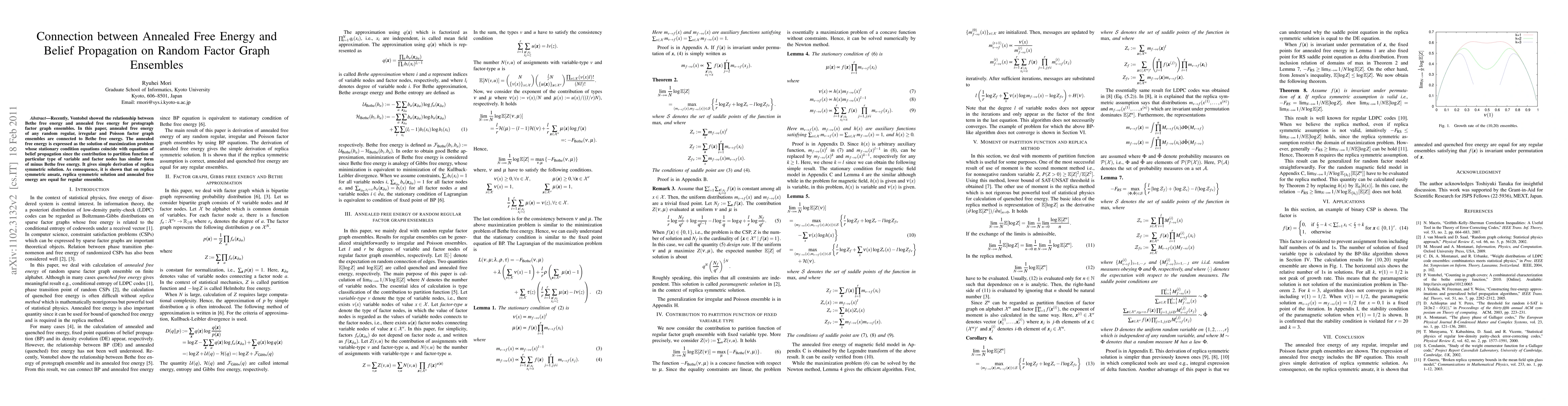 Recently, Vontobel showed the relationship between Bethe free energy and annealed free energy for protograph factor graph ensembles. In this paper, annealed free energy of any random regular, irregular and Poisson factor graph ensembles are connected to Bethe free energy. The annealed free energy is expressed as the solution of maximization problem whose stationary condition equations coincide with equations of belief propagation since the contribution to partition function of particular type of variable and factor nodes has similar form of minus Bethe free energy. It gives simple derivation of replica symmetric solution. As consequence, it is shown that on replica symmetric ansatz, replica symmetric solution and annealed free energy are equal for regular ensemble.