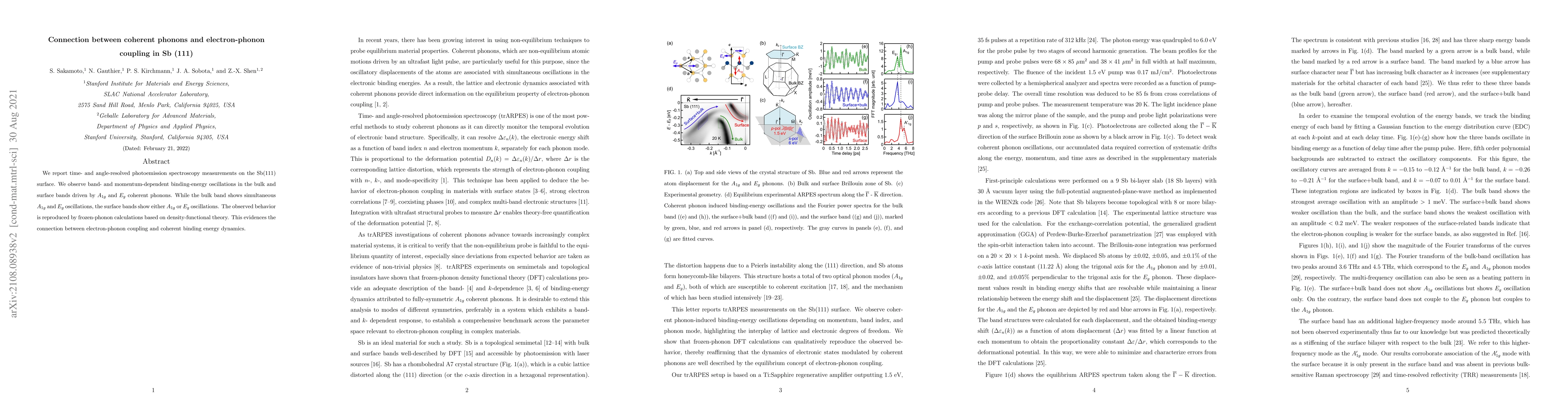 This research uses time- and angle-resolved photoemission spectroscopy to study Sb(111) surface phonons, revealing distinct electron-phonon coupling dynamics in bulk and surface bands driven by coherent phonons. The findings support a connection between coherent phonon behavior and electron-phonon interactions.