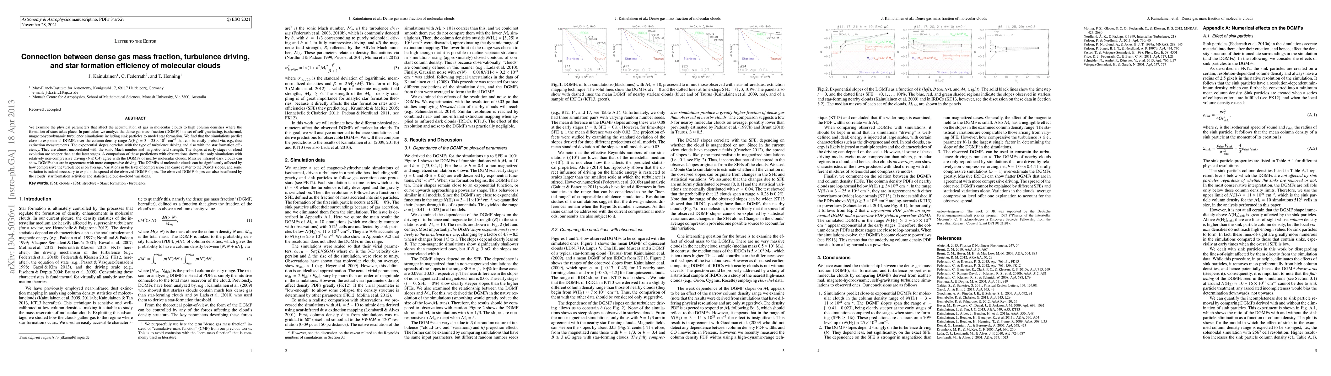 We examine the physical parameters that affect the accumulation of gas in molecular clouds to high column densities where the formation of stars takes place. In particular, we analyze the dense gas mass fraction (DGMF) in a set of self-gravitating, isothermal, magnetohydrodynamic turbulence simulations including sink particles to model star formation. We find that the simulations predict close to exponential DGMFs over the column density range N(H2) = 3-25 x 10^{21} cm^{-2} that can be easily probed via, e.g., dust extinction measurements. The exponential slopes correlate with the type of turbulence driving and also with the star formation efficiency. They are almost uncorrelated with the sonic Mach number and magnetic-field strength. The slopes at early stages of cloud evolution are steeper than at the later stages. A comparison of these predictions with observations shows that only simulations with relatively non-compressive driving (b ~< 0.4) agree with the DGMFs of nearby molecular clouds. Massive infrared dark clouds can show DGMFs that are in agreement with more compressive driving. The DGMFs of molecular clouds can be significantly affected by how compressive the turbulence is on average. Variations in the level of compression can cause scatter to the DGMF slopes, and some variation is indeed necessary to explain the spread of the observed DGMF slopes. The observed DGMF slopes can also be affected by the clouds' star formation activities and statistical cloud-to-cloud variations.
