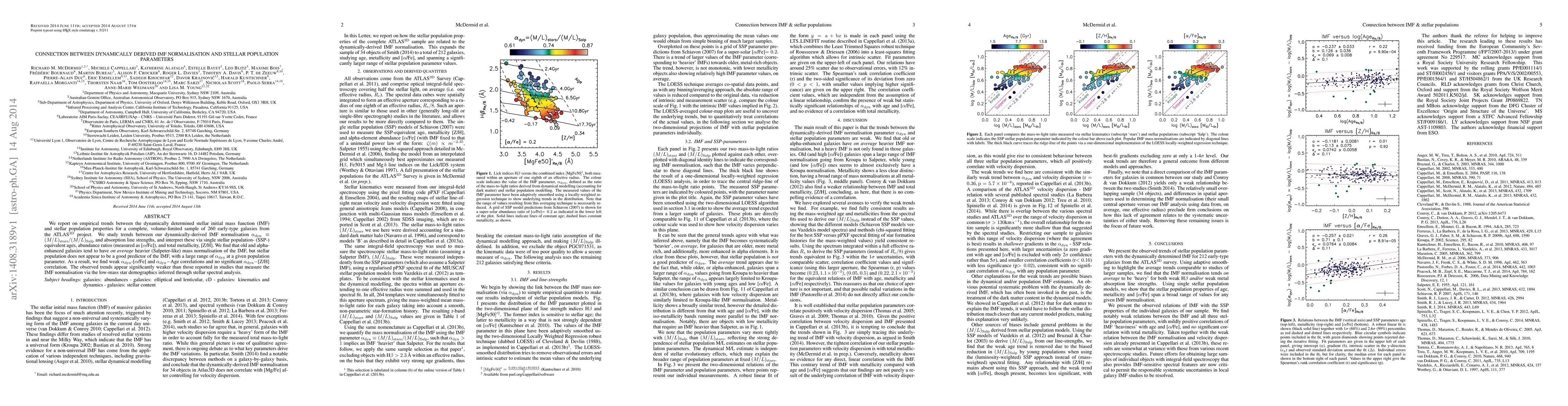 We report on empirical trends between the dynamically determined stellar initial mass function (IMF) and stellar population properties for a complete, volume-limited sample of 260 early-type galaxies from the Atlas3D project. We study trends between our dynamically-derived IMF normalisation and absorption line strengths, and interpret these via single stellar population- (SSP-) equivalent ages, abundance ratios (measured as [alpha/Fe]), and total metallicity, [Z/H]. We find that old and alpha-enhanced galaxies tend to have on average heavier (Salpeter-like) mass normalisation of the IMF, but stellar population does not appear to be a good predictor of the IMF, with a large range of normalisation at a given population parameter. As a result, we find weak IMF-[alpha/Fe] and IMF-age correlations, and no significant IMF-[Z/H] correlation. The observed trends appear significantly weaker than those reported in studies that measure the IMF normalisation via low-mass star demographics inferred through stellar spectral analysis.