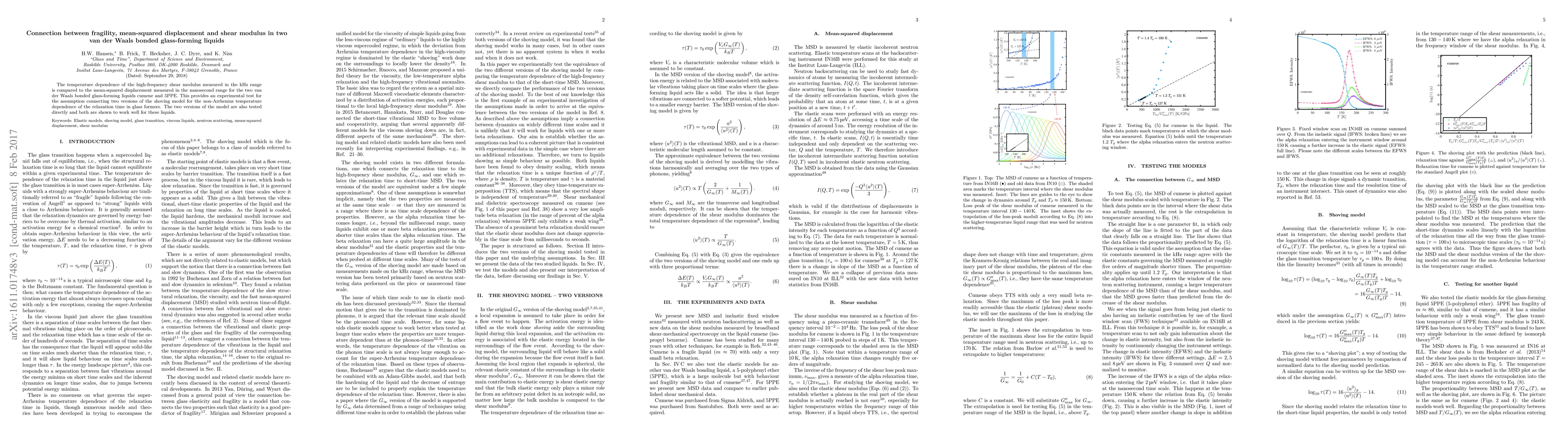 This study investigates the relationship between fragility, mean-squared displacement, and shear modulus in two van der Waals bonded glass-forming liquids, cumene and 5PPE, by comparing high-frequency shear modulus and nanosecond-scale mean-squared displacement measurements. Both versions of the shoving model for non-Arrhenius temperature dependence of relaxation time are validated for these liquids.