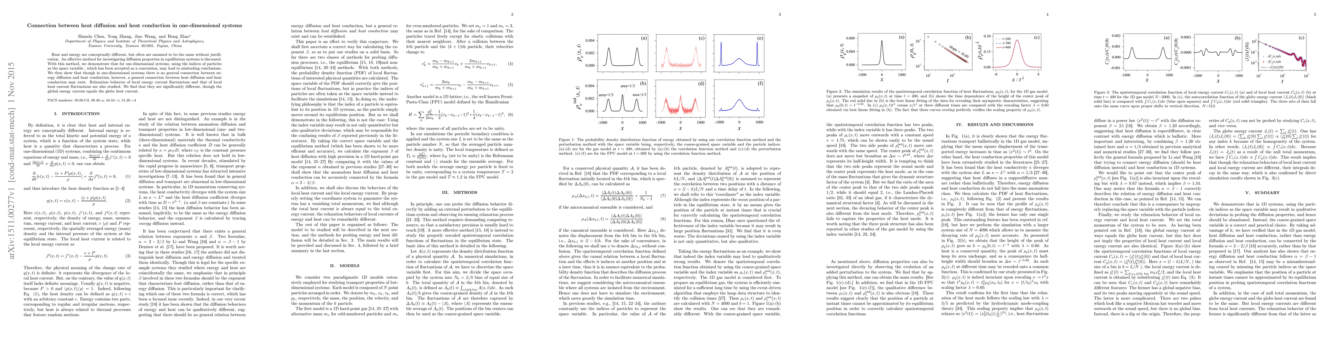 Heat and energy are conceptually different, but often are assumed to be the same without justification. An effective method for investigating diffusion properties in equilibrium systems is discussed. With this method, we demonstrate that for one-dimensional systems, using the indices of particles as the space variable , which has been accepted as a convention, may lead to misleading conclusions. We then show that though in one-dimensional systems there is no general connection between energy diffusion and heat conduction, however, a general connection between heat diffusion and heat conduction may exist. Relaxation behavior of local energy current fluctuations and that of local heat current fluctuations are also studied. We find that they are significantly different, though the global energy current equals the globe heat current.
