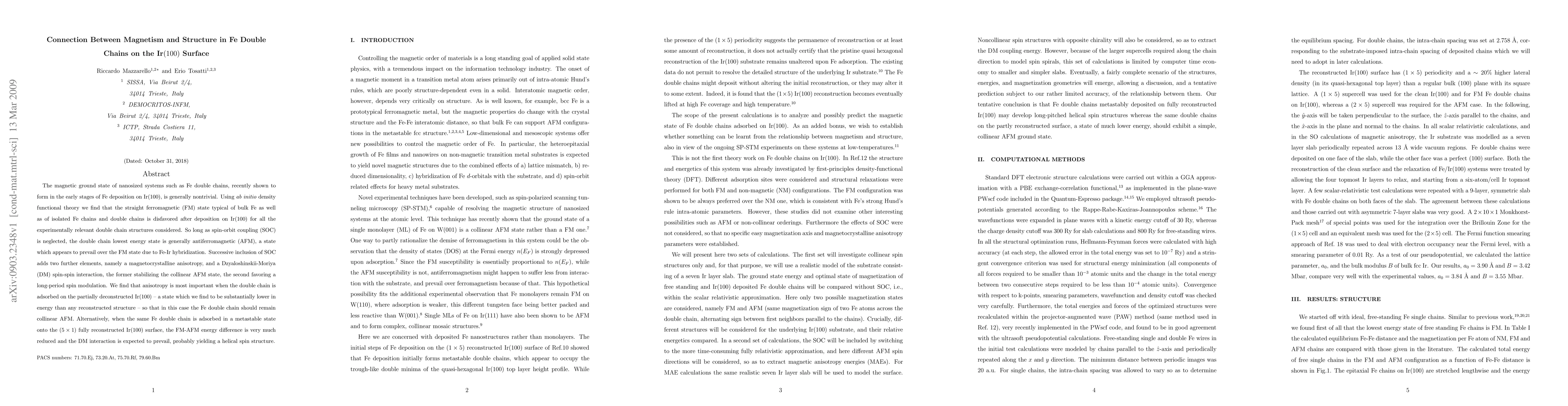 This study reveals that Fe double chains on the Ir(100) surface predominantly adopt antiferromagnetic states due to Fe-Ir hybridization, with spin-orbit coupling introducing magnetocrystalline anisotropy and Dzyaloshinskii-Moriya interactions that stabilize different spin configurations depending on the surface reconstruction.
