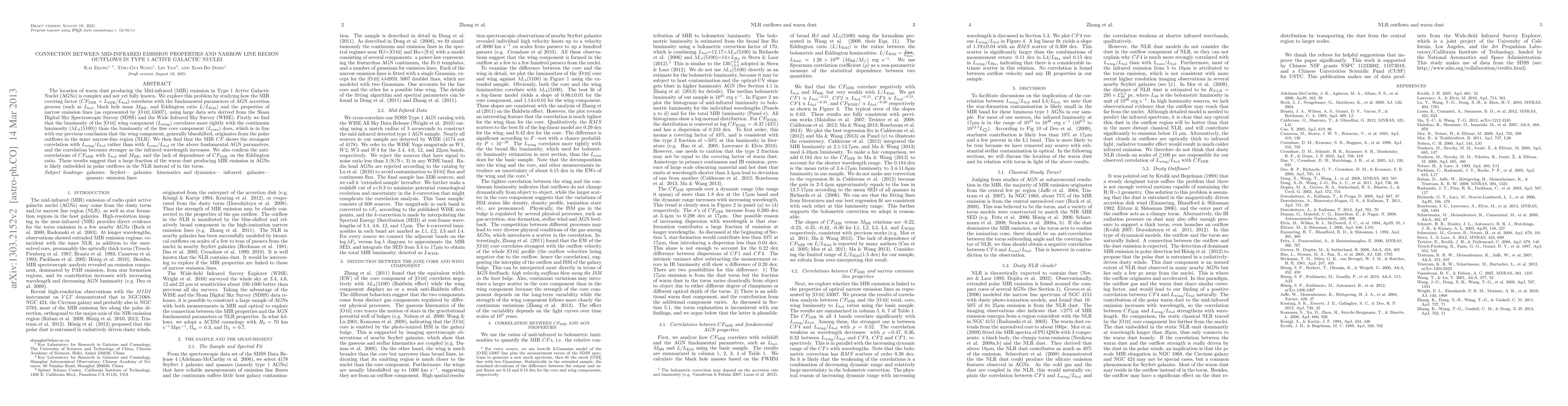 This paper investigates the relationship between mid-infrared emission properties and narrow-line region outflows in Type 1 Active Galactic Nuclei (AGNs). It finds that the mid-infrared covering factor correlates strongly with the luminosity of the blueshifted, wing component of the [O III] line, suggesting that warm dust producing mid-infrared emission is embedded in polar outflows rather than in the torus.