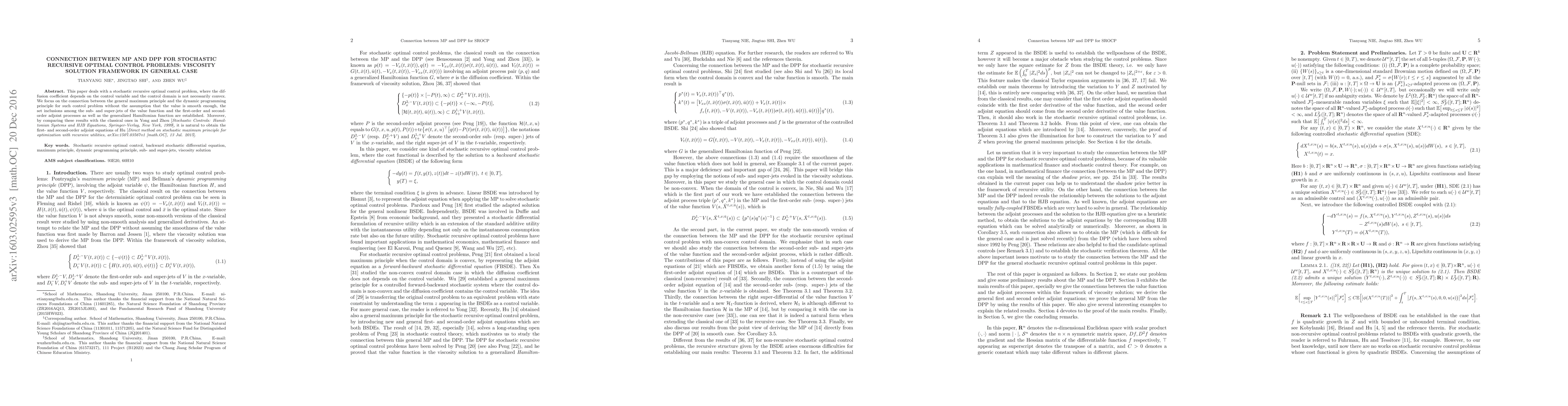 This paper deals with a stochastic recursive optimal control problem, where the diffusion coefficient depends on the control variable and the control domain is not necessarily convex. We focus on the connection between the general maximum principle and the dynamic programming principle for such control problem without the assumption that the value is smooth enough, the set inclusions among the sub- and super-jets of the value function and the first-order and second-order adjoint processes as well as the generalized Hamiltonian function are established. Moreover, by comparing these results with the classical ones in Yong and Zhou [{\em Stochastic Controls: Hamiltonian Systems and HJB Equations, Springer-Verlag, New York, 1999}], it is natural to obtain the first- and second-order adjoint equations of Hu [{\em Direct method on stochastic maximum principle for optimization with recursive utilities, arXiv:1507.03567v1 [math.OC], 13 Jul. 2015}].