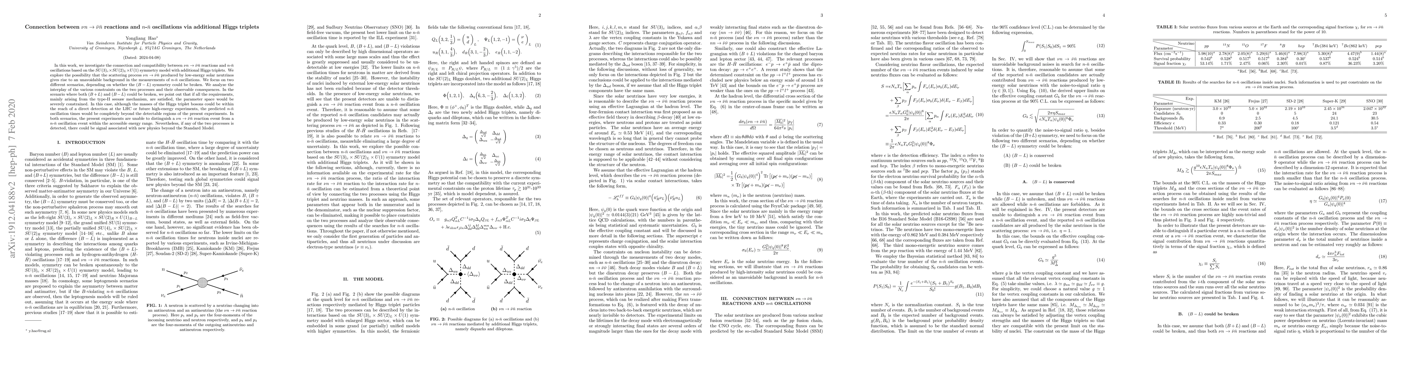 In this work, we investigate the connection and compatibility between $\nu n \rightarrow \bar{\nu} \bar{n}$ reactions and $n$-$\bar{n}$ oscillations based on the $SU(3)_c \times SU(2)_L \times U(1)$ symmetry model with additional Higgs triplets. We explore the possibility that the scattering process $\nu n\rightarrow \bar{\nu}\bar{n}$ produced by low-energy solar neutrinos gives rise to an unavoidable background in the measurements of $n$-$\bar{n}$ oscillations. We focus on two different scenarios, depending on whether the $(B-L)$ symmetry could be broken. We analyze the interplay of the various constraints on the two processes and their observable consequences. In the scenario where both $(B+L)$ and $(B-L)$ could be broken, we point out that if all the constraints, mainly arising from the type-II seesaw mechanism, are satisfied, the parameter space would be severely constrained. In this case, although the masses of the Higgs triplet bosons could be within the reach of a direct detection at the LHC or future high-energy experiments, the predicted $n$-$\bar{n}$ oscillation times would be completely beyond the detectable regions of the present experiments. In both scenarios, the present experiments cannot distinguish a $\nu n \rightarrow \bar{\nu} \bar{n}$ reaction event from a $n$-$\bar{n}$ oscillation event within the accessible energy range. Nevertheless, if any of the two processes is detected, there could be signal associated with new physics beyond the Standard Model.